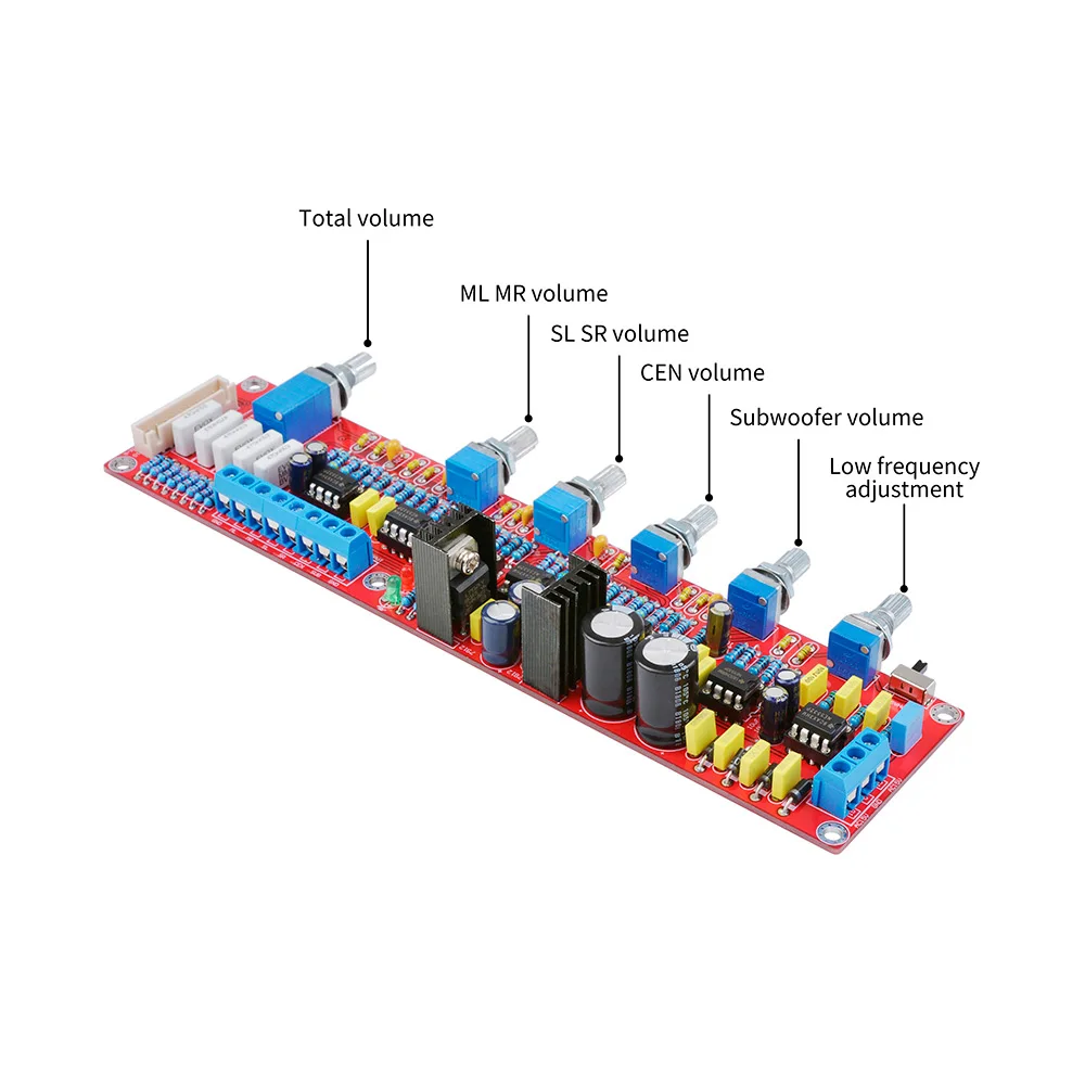 7. Функция потенциометра: низкочастотная регулировка, громкость сабвуфера. Объем CEN, объем SL SR, объем ML MR, основной объем.