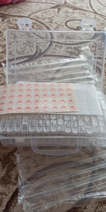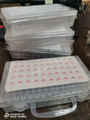 Доставка очень быстрая. В Екатеринбург посылка прибыла за 9 дней. Трек отслеживался на всем пути следования. Упаковано очень надёжно - аэропакет. Коробочки с ручками приехали абсолютно целые. Размеры соответствуют заявленным продавцом. Для организации хранения остатков страз от алмазной мозайки - отличный вариант. В комплект входят самоклеящейся наклейки - 64 шт. (чистые, для самостоятельного присвоения номеров) + 1 лист с готовой нумерацией от 1 до 50. Вместительность - 5 гр. Крышка ячейки имеет функцию полного и частичного открывания. Я очень довольна покупкой. Все аккуратно, компактно, эстетично, и конечно же удобно. Продавца рекомендую.