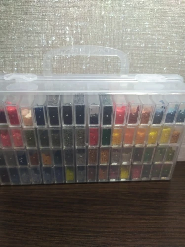 Органайзер для алмазной вышивки очень хороший. Ёмкости для страз удобные, открываются сверху, прямоугольной формы. Дополнительно заказала приспособление - воронку для удобства загрузки и выгрузки страз. Так же в наборе присутствуют клеящиеся этикетки. Рекомендую мастерицам, увлекающимся техникой алмазного творчества.