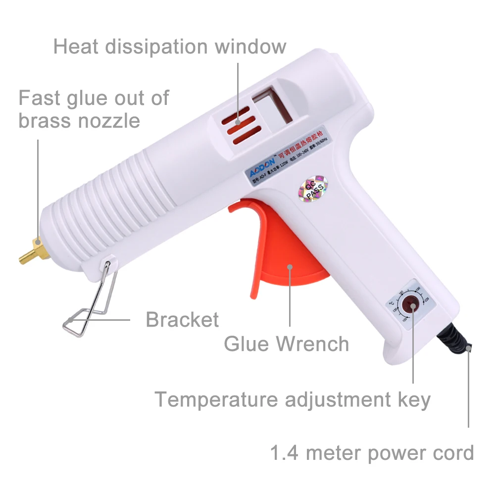 Мне достался пистолет под маркой «Aodon 120 W» Большой такой, добротный. Больше пистолета ТТ =) Теплоёмкий. Можно разогреть, выключить от сети и подклеить там, где рядом нет розетки. Две индикаторных лампочки, одна индикатор сети, вторая индикатор нагрева термостата (как на утюге). С конца не капает.