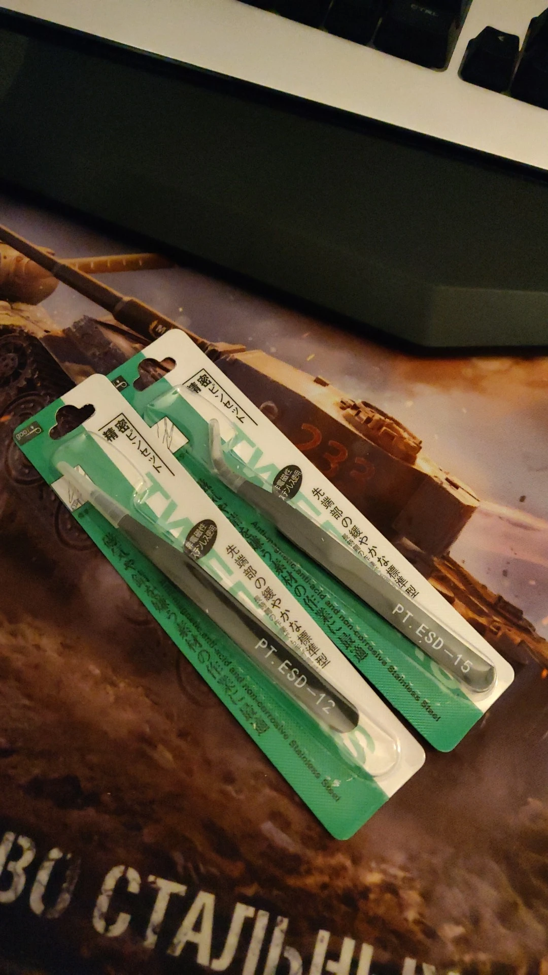 Пинцеты не как на фото, для того чтобы ими пользоваться нужно их притереть и заточить. А ещё они сделаны из магнитного материала, хотя на упаковке написано anti-magnetic. Судя по японским надписям на упаковке, это подделка каких-то японских пинцетов или вариант для экспорта в Японию :)