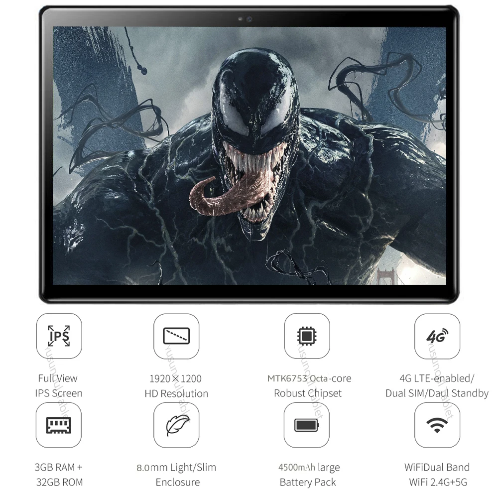 Разрешение Google Play 10 дюймов HD1920*1200Две sim-карты IPS4G FDD-LTEПланшетный ПКMT6753Восьмиядерный прочный чип3 Гб оперативной памяти32 Гб ПЗУ8. MpWifi 2,4G + 5G,4500mAh большой аккумулятор,8,0 мм светильник/тонкий корпус + подарки