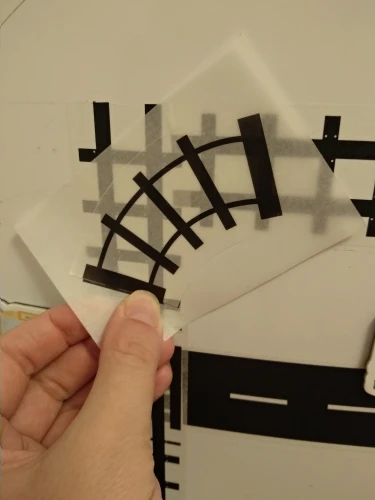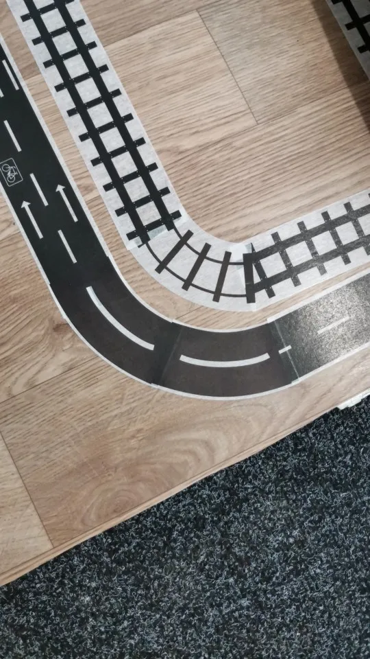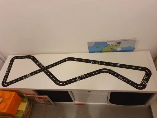 Дорога сделана на основе бумажного скотча, достаточно прочная, на холодильнике продержалась уже неделю. Из недостатков - края отходят, задираются при использовании машинок-магнитов. Те, что на колесах, владелец в этом месте ещё не катал. И приходится ставить латки на отходящие места. Для поворотов это большой недостаток. Дуга поворота больше 90°, обреза́ла.