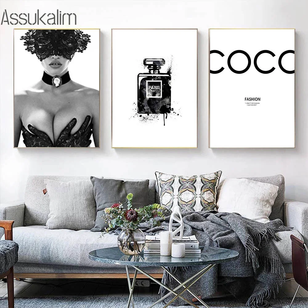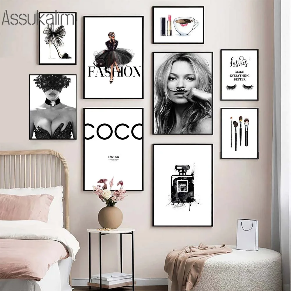 Модный постер с принтом флакона духов, Картина на холсте для макияжа, черно-белые постеры, скандинавские настенные картины для декора гостиной