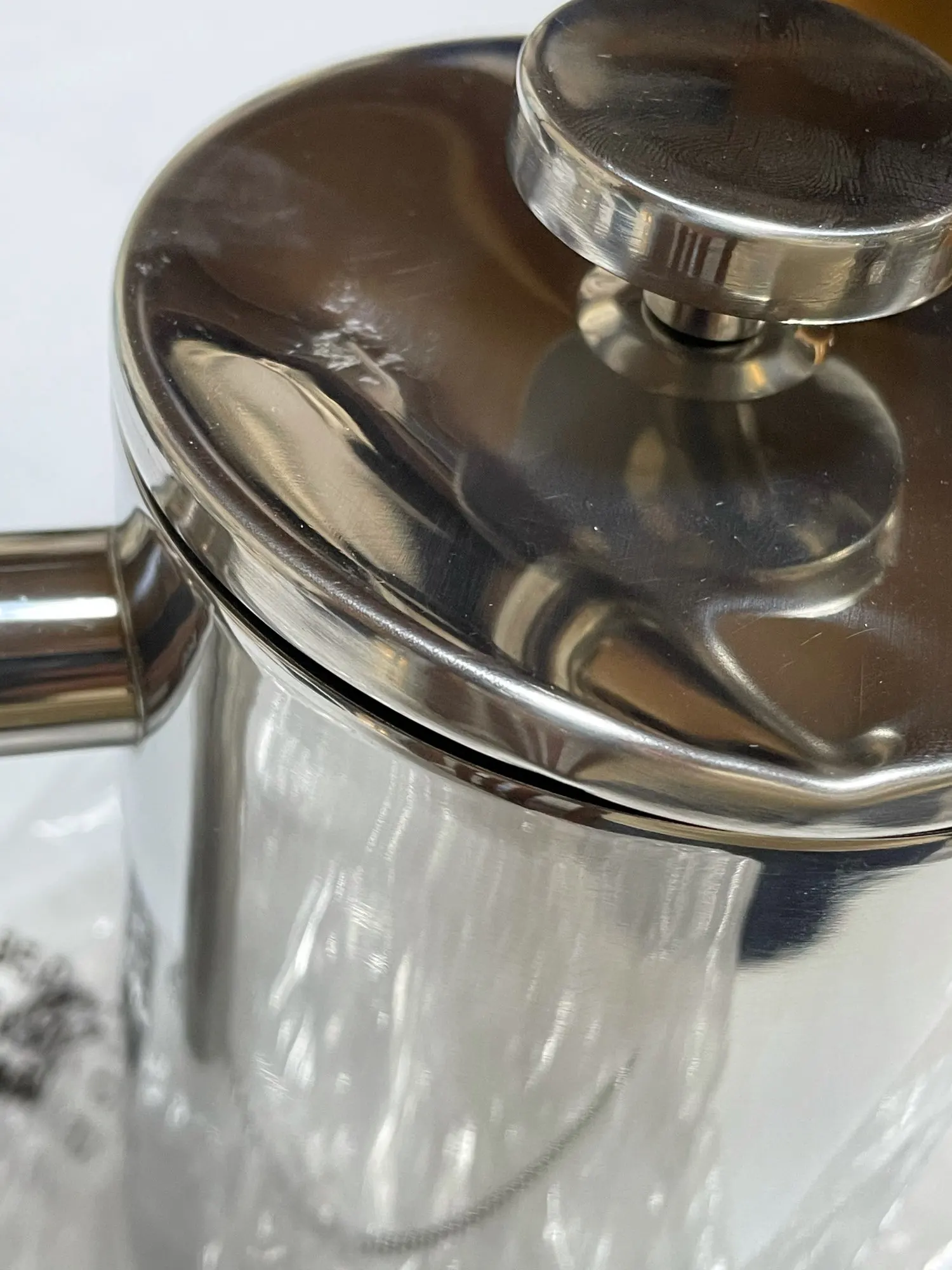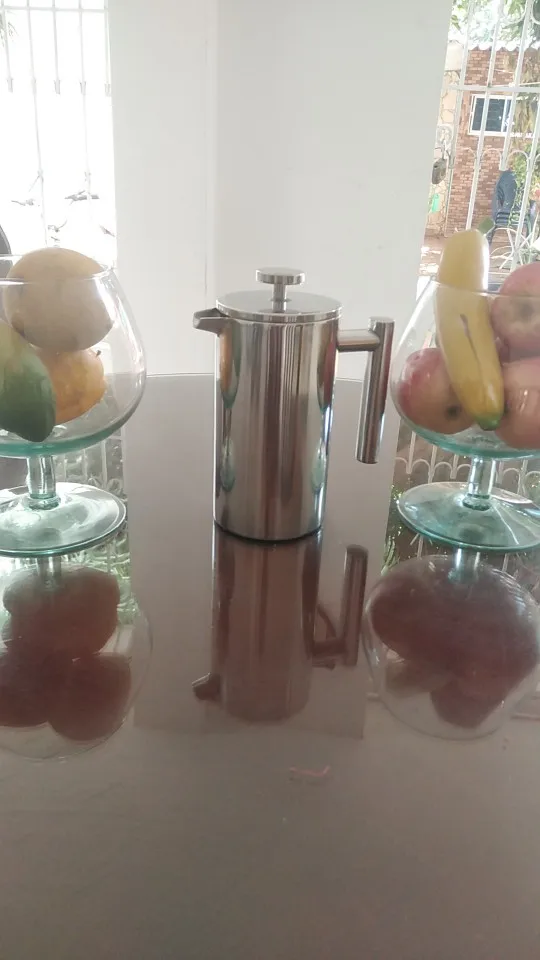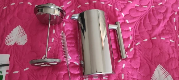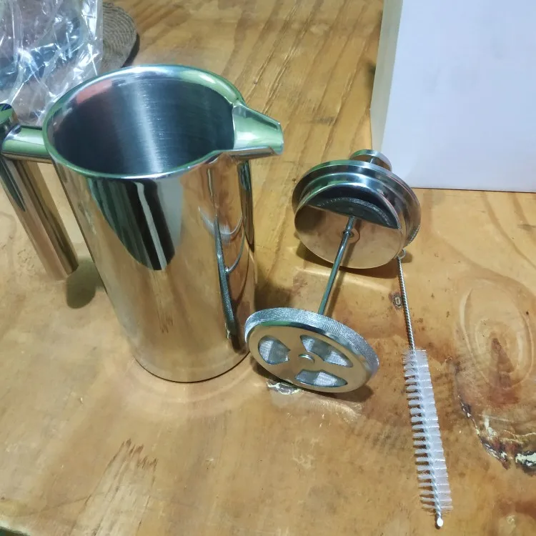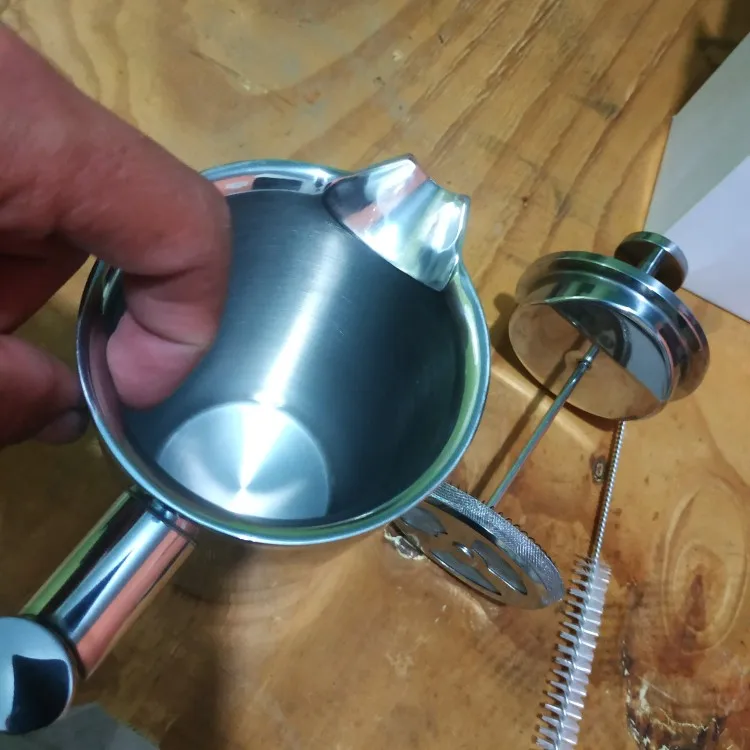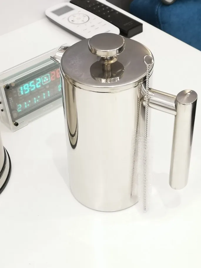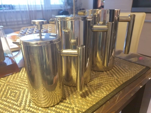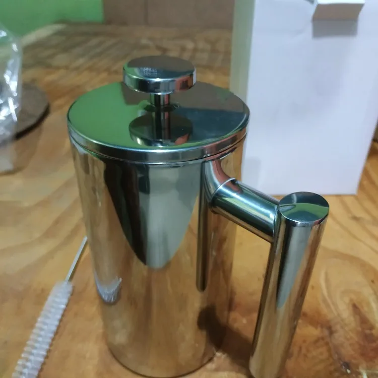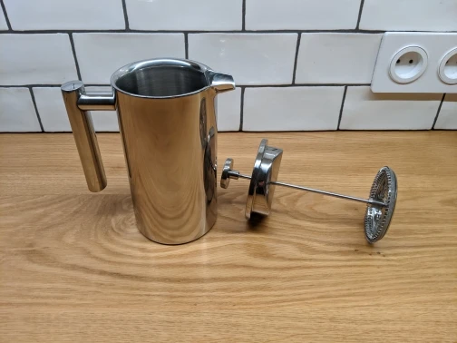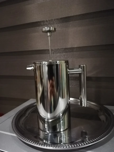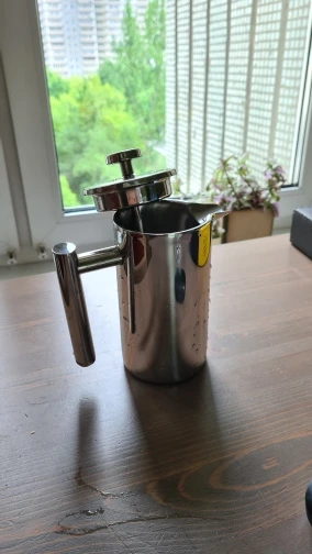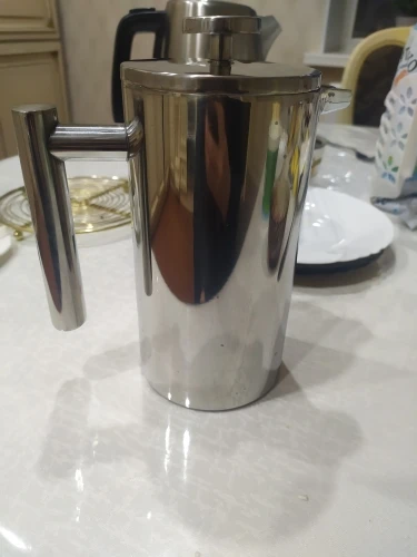 Классный френч! Сделан не из фольги и довольно увесистый. Металл приятный и выглядит премиально. Стенки и крышка - двойные. Фото с гранёным стаканом для масштаба. По факту во френч объёмом 800 влезет около 600 мл напитка. Могу смело рекомендовать к покупке.