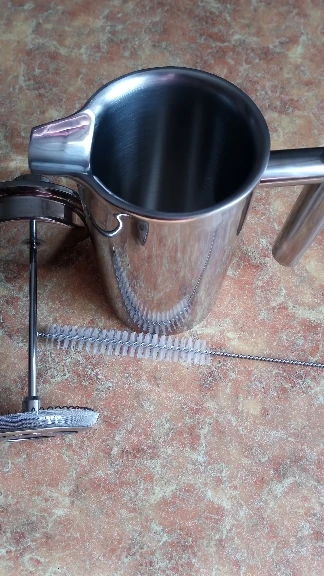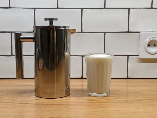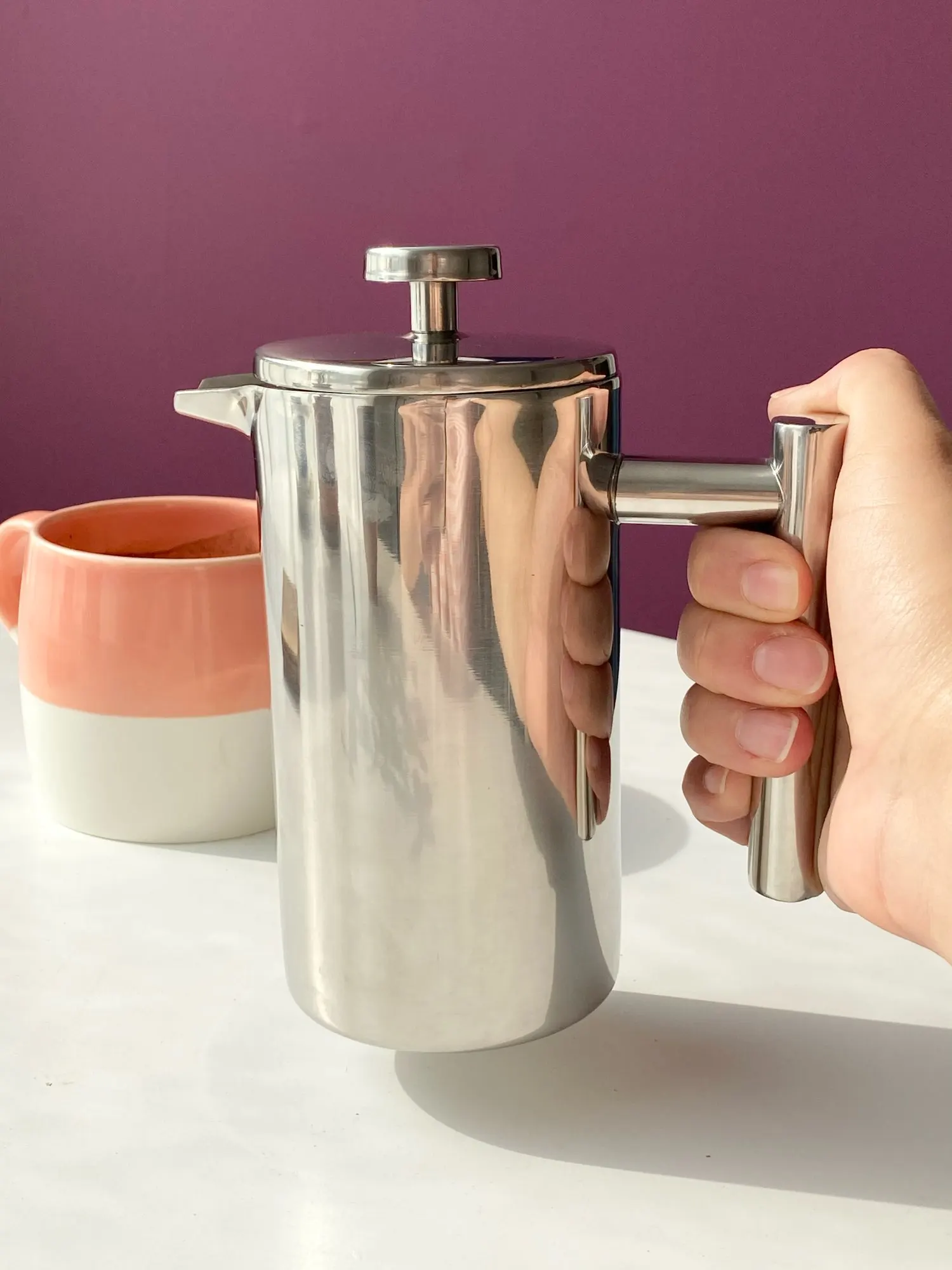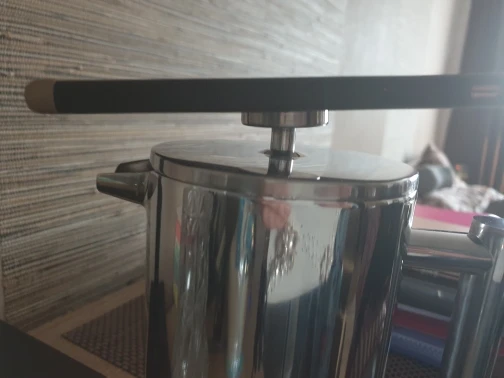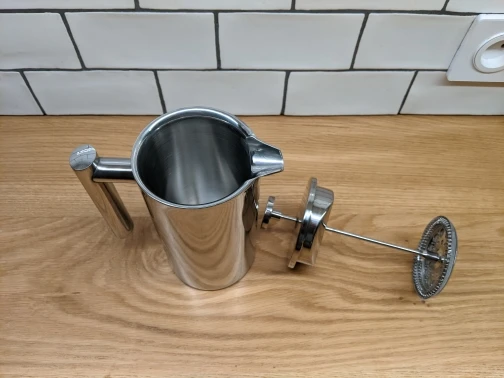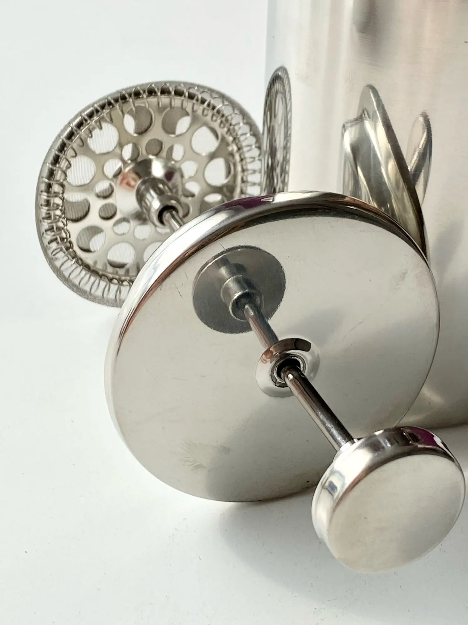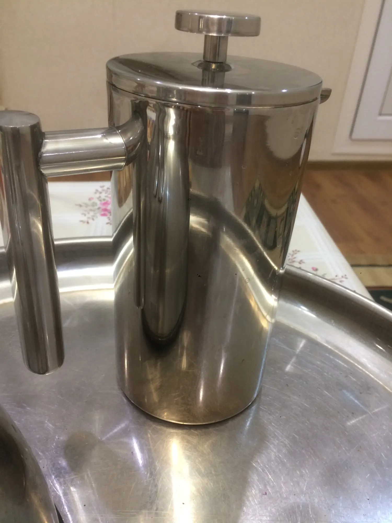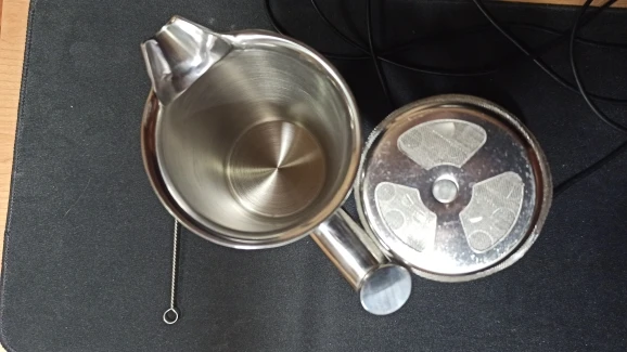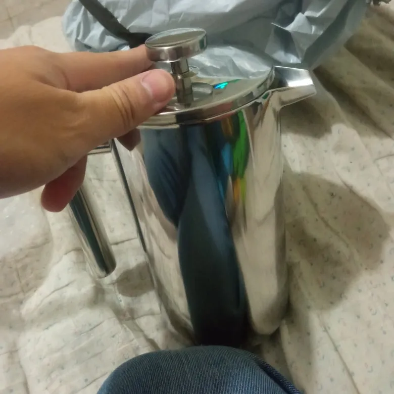 Классный френч! Сделан не из фольги и довольно увесистый. Металл приятный и выглядит премиально. Стенки и крышка - двойные. Фото с гранёным стаканом для масштаба. По факту во френч объёмом 800 влезет около 600 мл напитка. Могу смело рекомендовать к покупке.