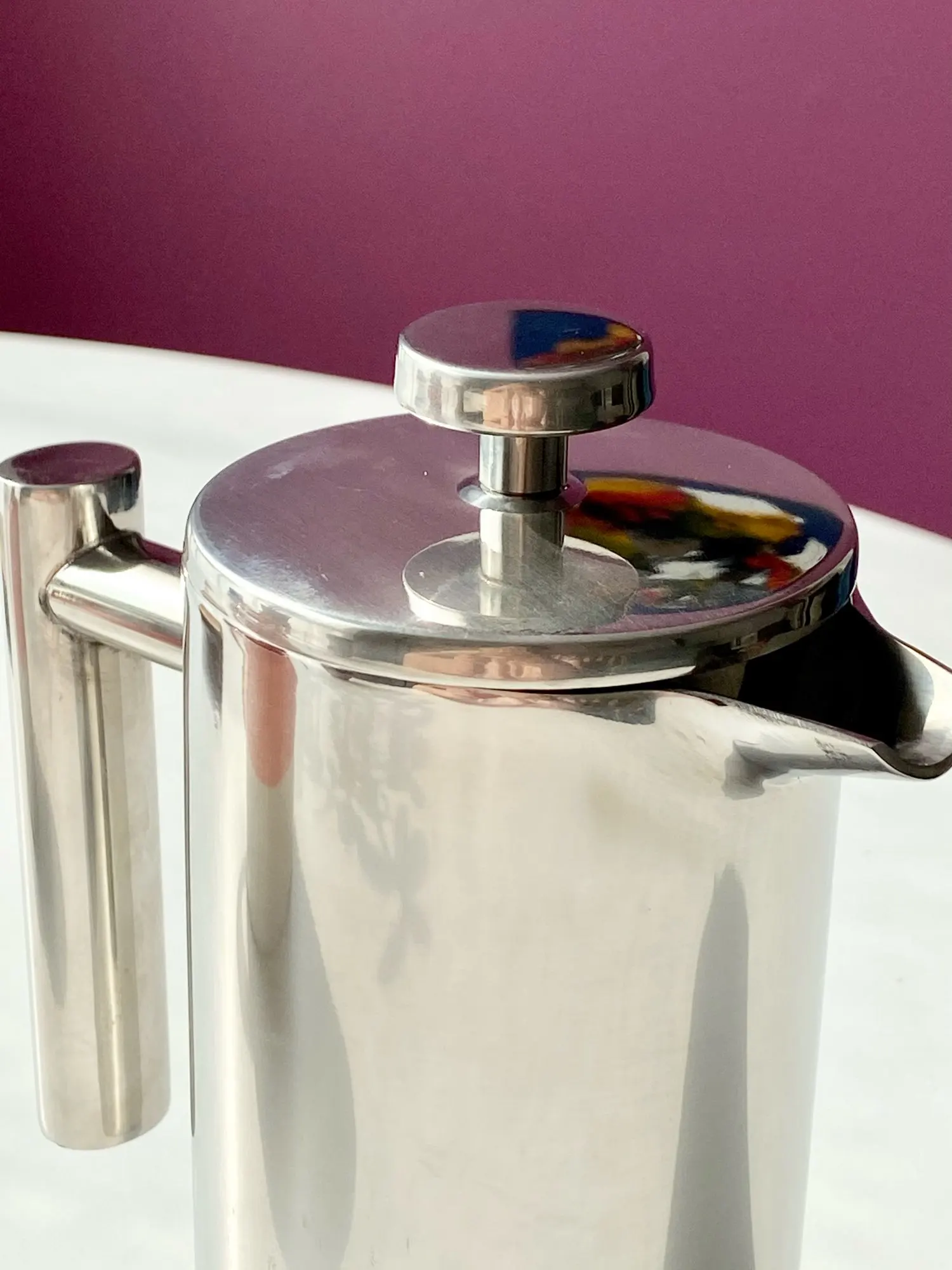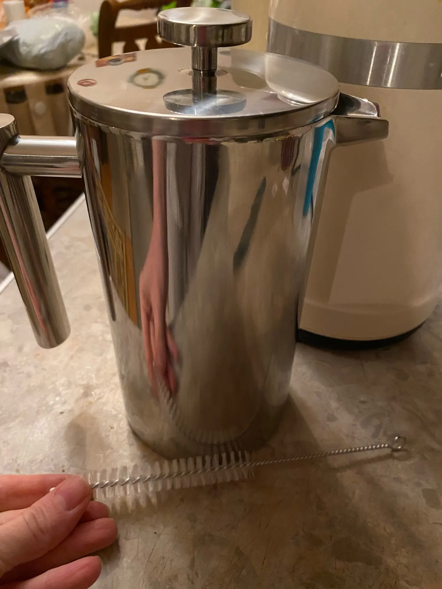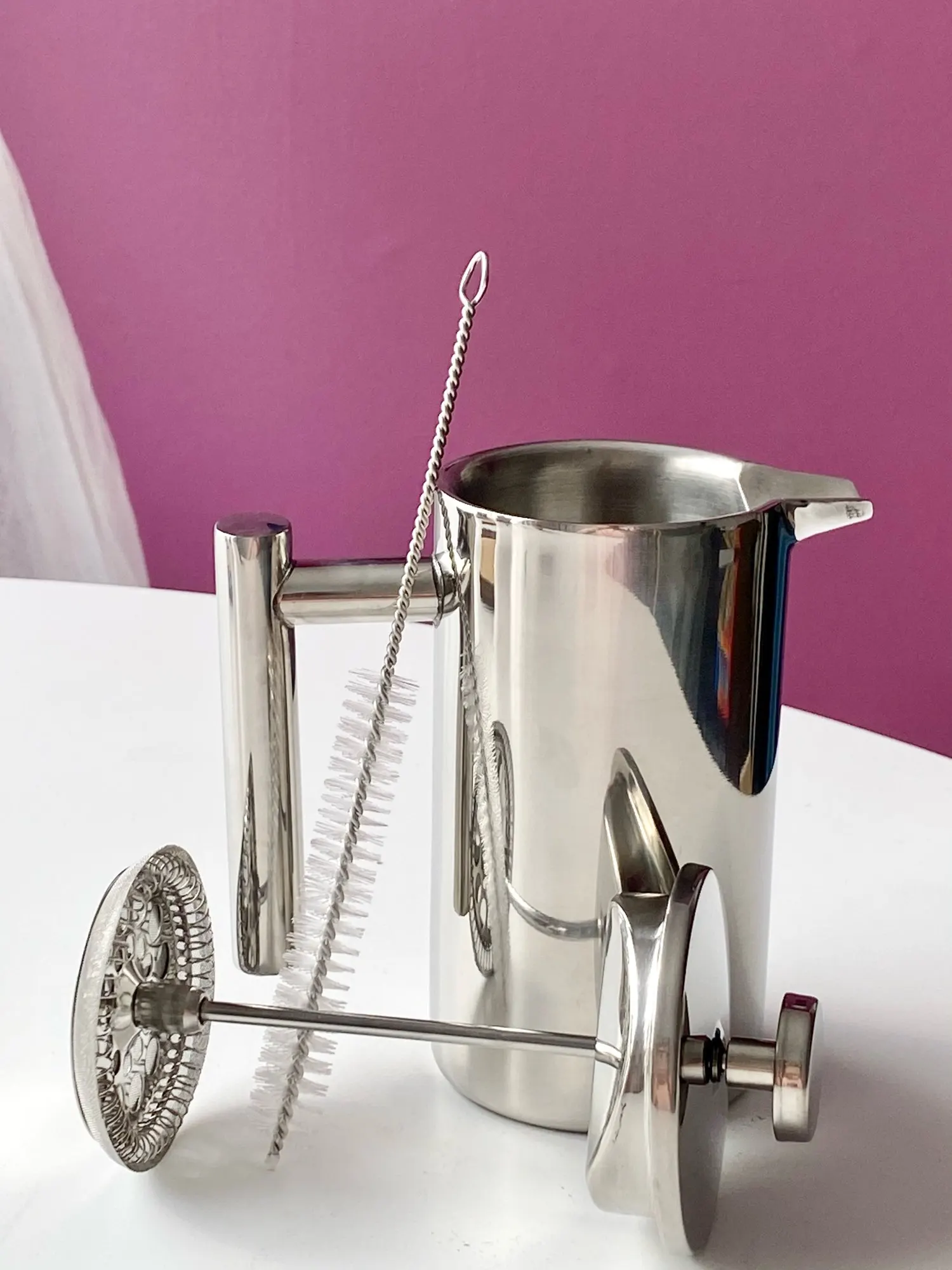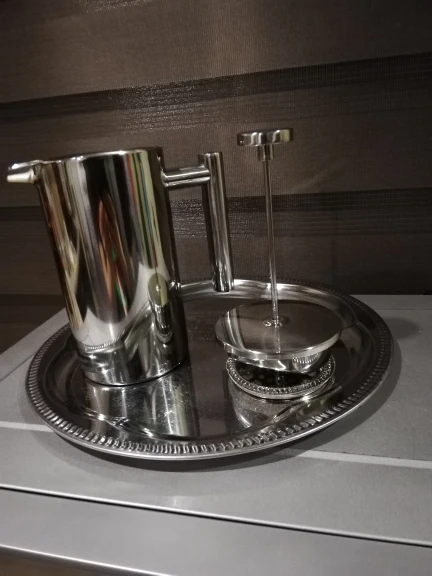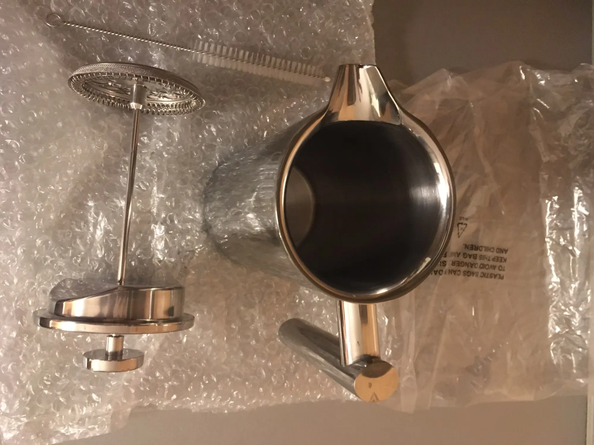 Классный френч! Сделан не из фольги и довольно увесистый. Металл приятный и выглядит премиально. Стенки и крышка - двойные. Фото с гранёным стаканом для масштаба. По факту во френч объёмом 800 влезет около 600 мл напитка. Могу смело рекомендовать к покупке.