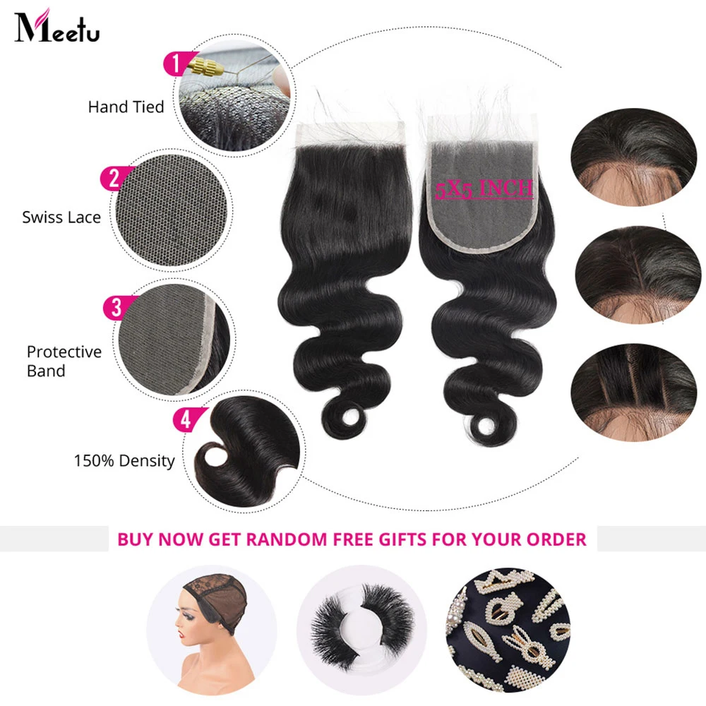 Пряди натуральных волнистых волос Meetu 5x5, пряди волнистых волос из Малайзии с застежкой