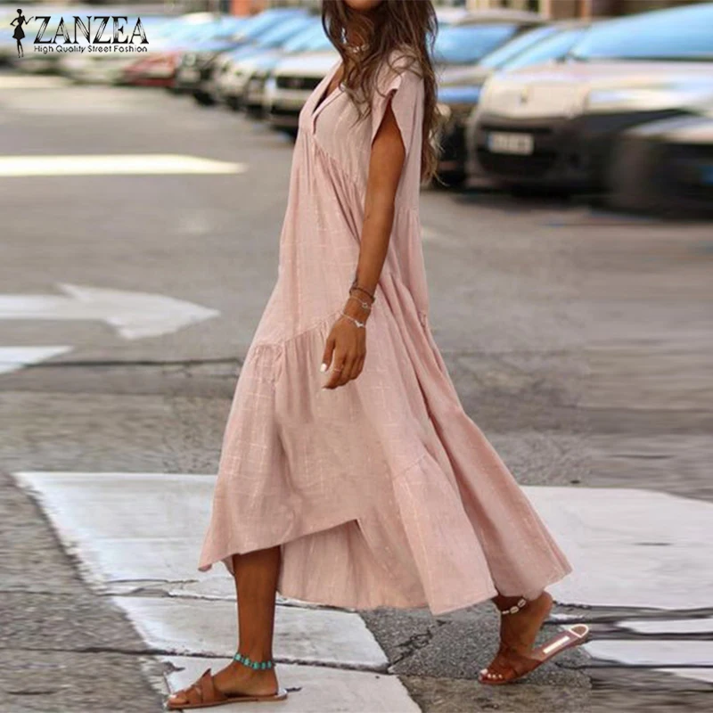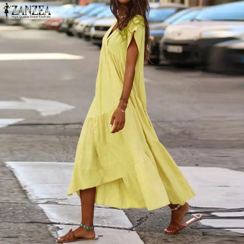 Женское платье с рюшами, Асимметричный Сарафан ZANZEA 2021, летнее макси-платье с коротким рукавом