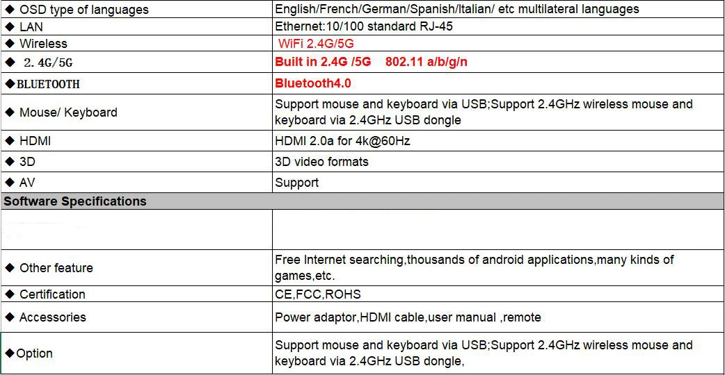 -Процессор: RK3318 четырехъядерный 64 бит Cortex-A53 -GPU: Penta-Core Mali-450 до 750 МГц + -ОЗУ: 2 ГБ/4 ГБ -ROM: EMMC 16 Гб/32 ГБ/64 ГБ -ОС Android 10,0 -2,4G/5G Dual WIFI , BT4.0 -Поддерживает режимы 3D , 4K , HDR10 и HLG -USB 3,0, цифровой дисплей Есть 3 варианта для HK1 MINI Plus:A: 2 Гб Оперативная память + 16 Гб Встроенная память + 2,4G & 5G, Wi-Fi + BT4.0B: 4 Гб Оперативная память + 32 ГБ Встроенная память + 2,4G & 5G, Wi-Fi + BT4.0C: 4 Гб RAM + 64 Гб ROM + 2,4G & 5G Wifi + BT4.0