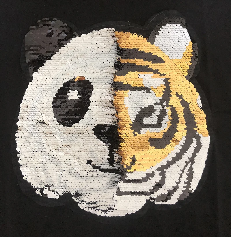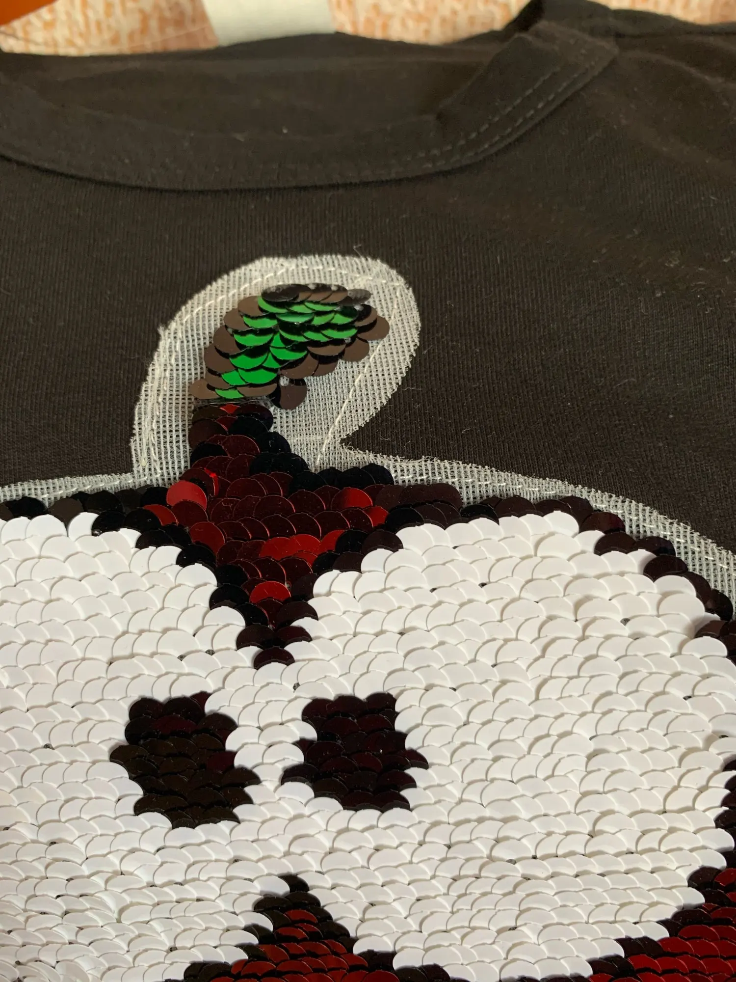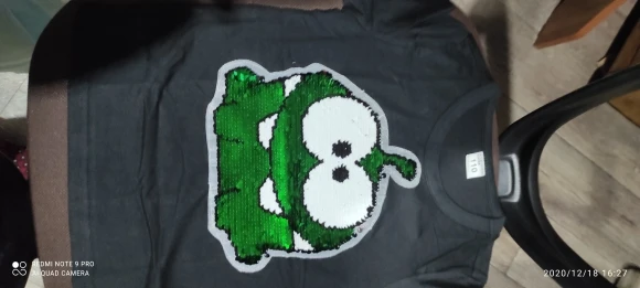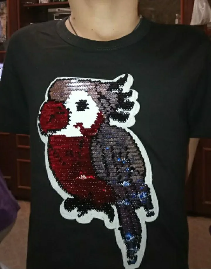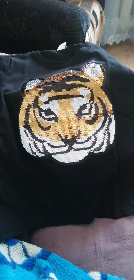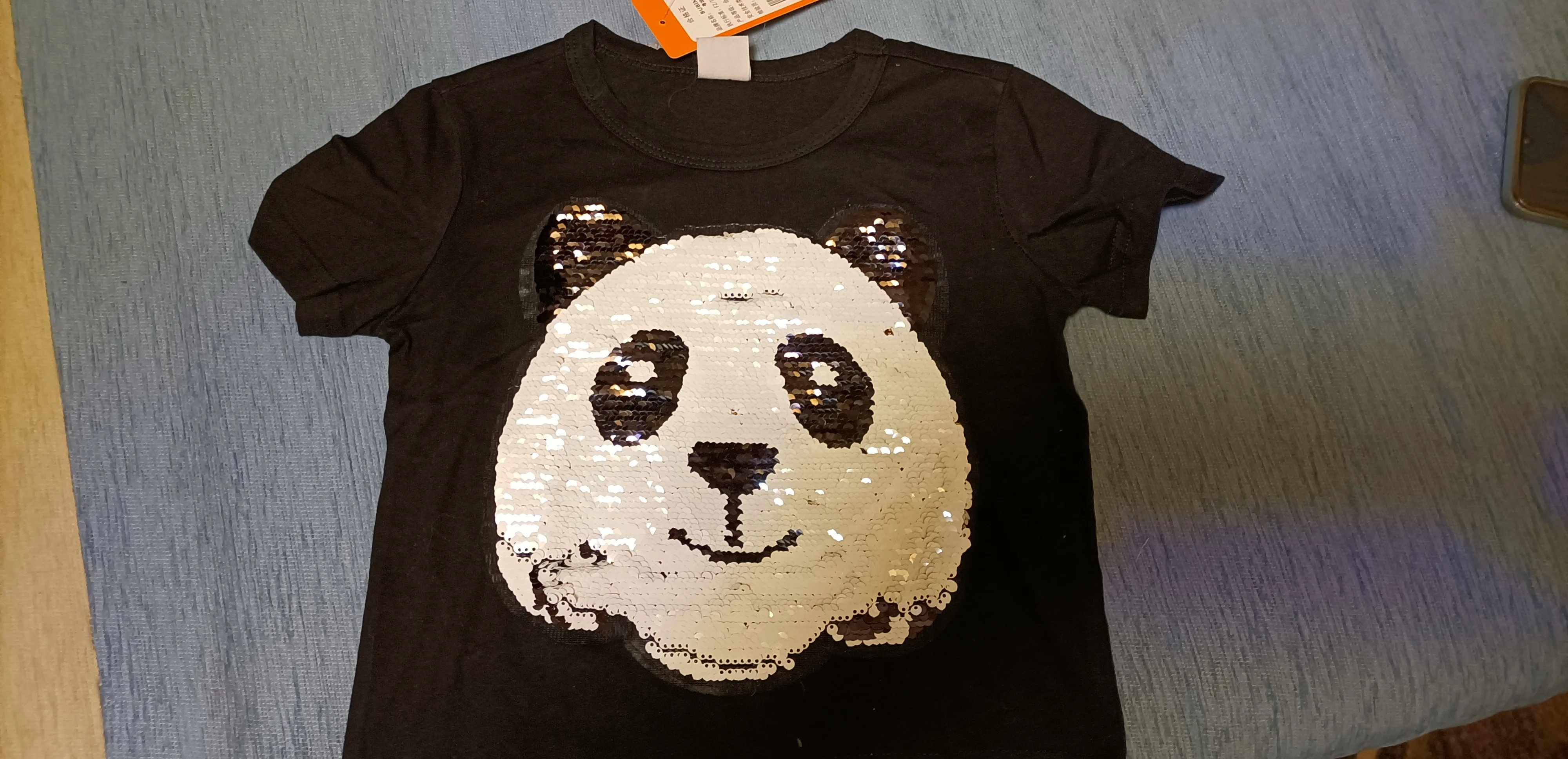 потрясающая футболка! материал - плотный хлопок, тигр превращается в панду и обратно без косяков и проблем. пайетки пришиты на вид неплохо, нитки не торчат. горло широкое, на голову натягивается без проблем. на рост 82 (1,5 года) - размер 3Т (на этикетке написано 100) - сильно велик, но сейчас зимой его все равно некуда носить, к лету будет нормально, думаю, еще и с запасиком. даже не знаю, кому больше нравится играть с пайетками - дочке или папе, тот вообще обалдел когда такое увидел. заказ приехал ровно за 2 недели в Тульскую область, с доставкой в пятерочку