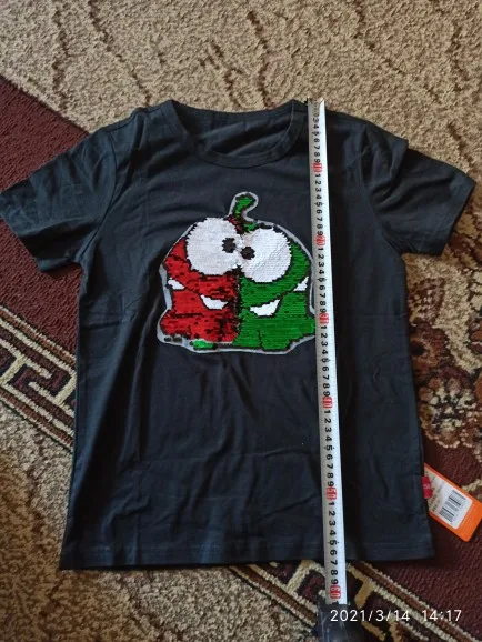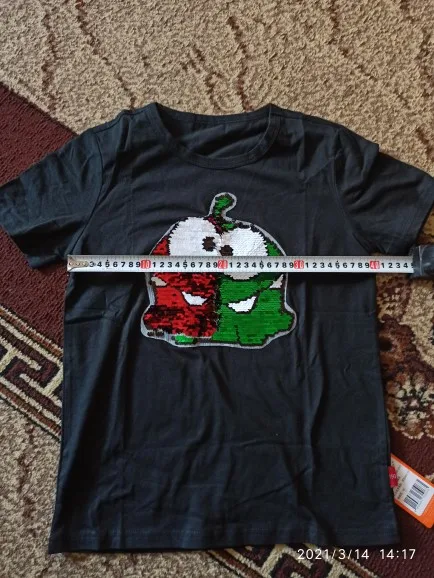 Красивая футболка, блестки очень хорошие. Без размера p Очень большой. Я потратил 10 лет на своего 8 летнего сына, он сразу же отправится к нему.