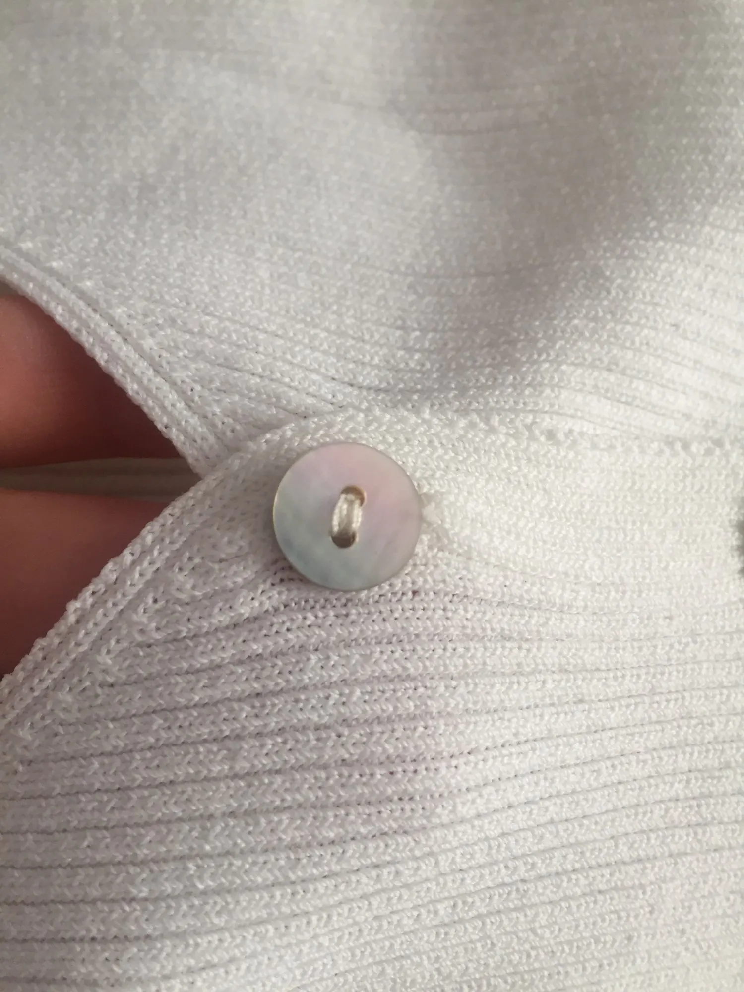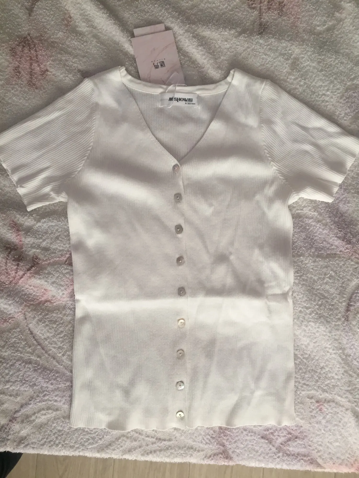 На фото продавца футболка белая, по факту немного желтит - скорее даже молочная. Прорези для пуговиц не очень аккуратные, но в общем-то расстегивать их нет необходимости. Мне просто было любопытно. Сами пуговицы интересные. С одной стороны (внешней) они перламутровые, с другой стороны (которая пришита к футболке) черепашковая расцветка. Есть запасная пуговица. В характеристике материал футболки значится как полиамид, на бирке указано 63.7% вискозное волокно и 36.3% нейлон. Ткань приятная на ощупь, прохладная, но не знаю, как будет ощущаться в жару на улице. Сильно просвечивает, хорошо тянется. Обычно ношу S, но размер М подошёл в самый раз (ОГ ~82см, ОТ 67см). Думаю над возвратом или перепродажей, потому что мне по стилю не подходит, а так футболка неплохая
