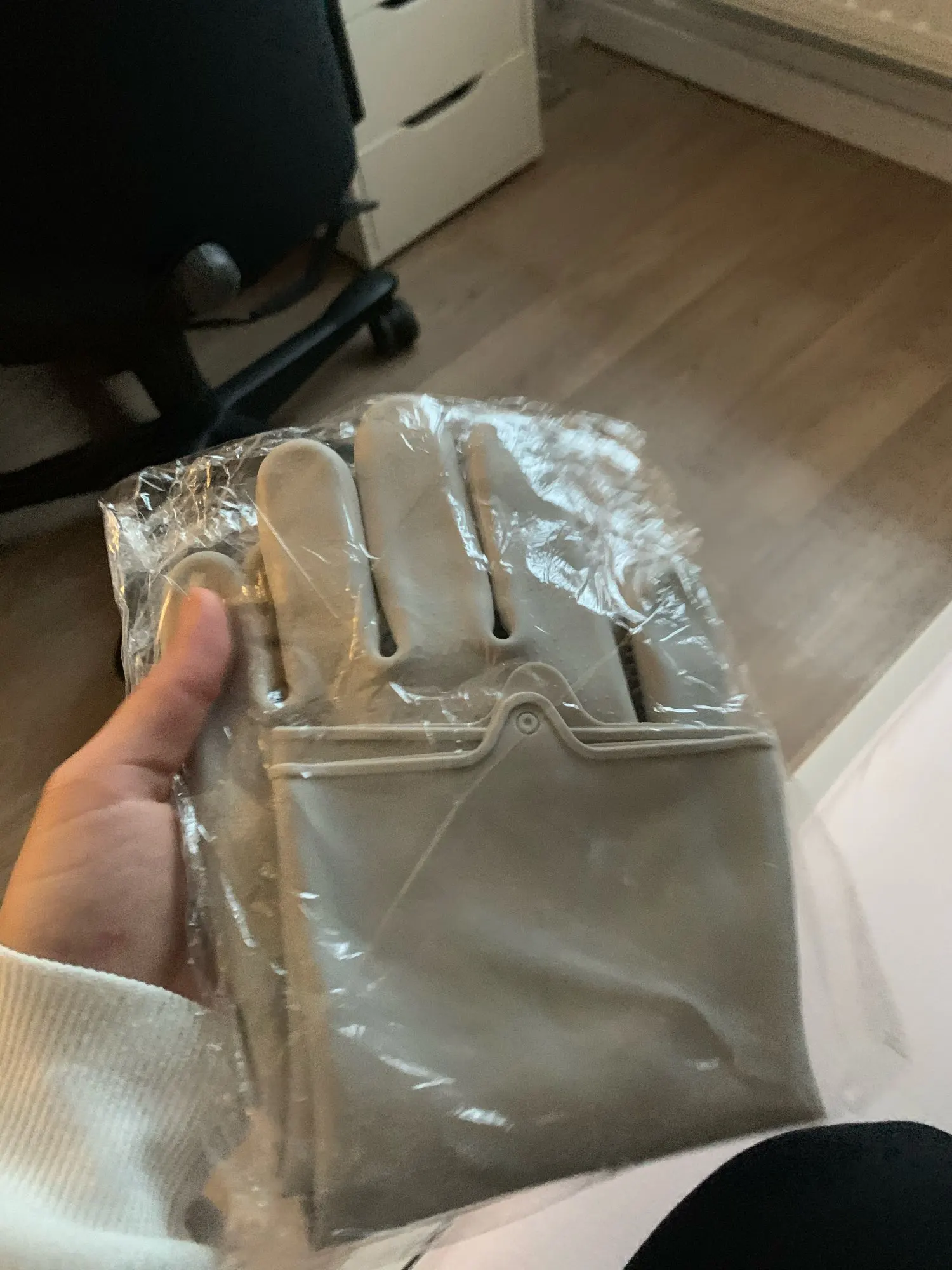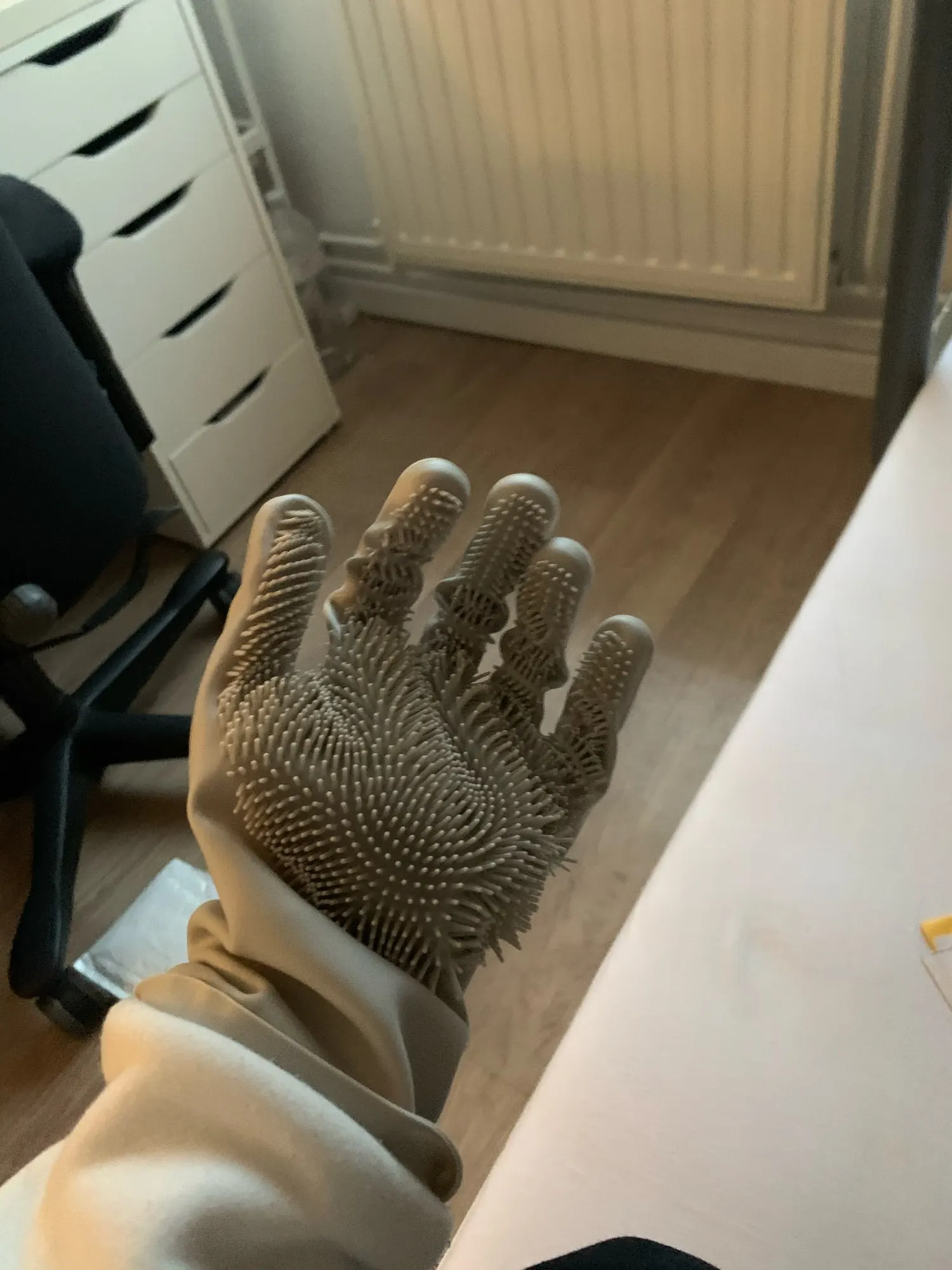 Перчатки прикольные, колючки мягкие, как в работе будут себя вести пока не знаю. Касательно доставки, всего 16 дней до Парижа. Повесила на крючок, очень нравятся.