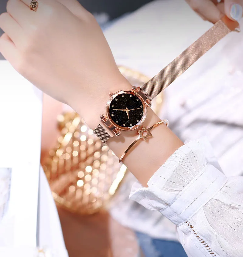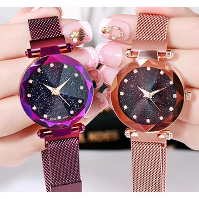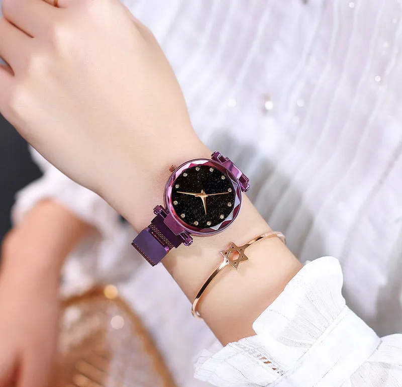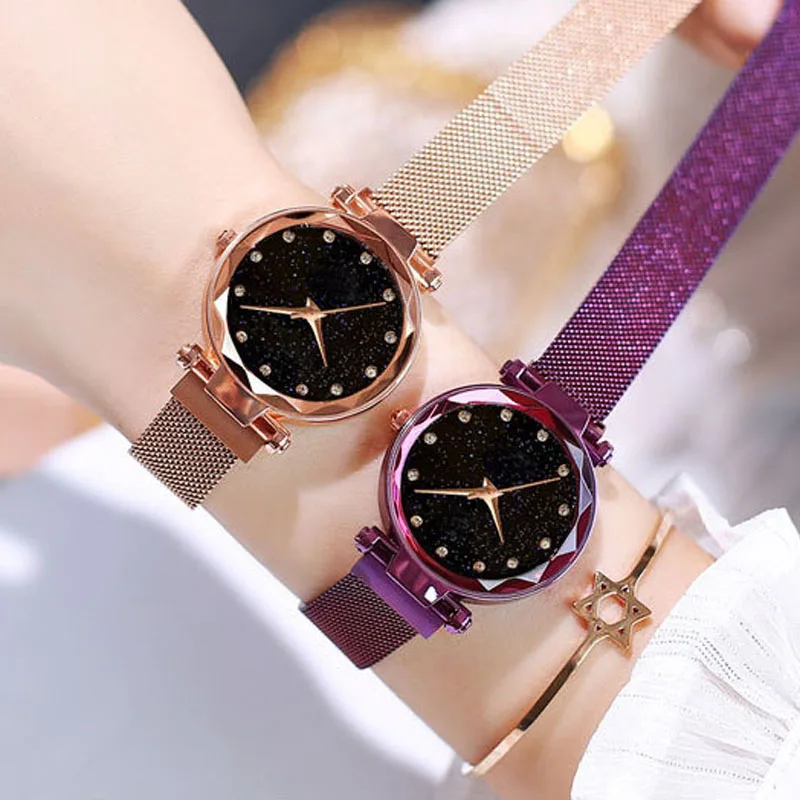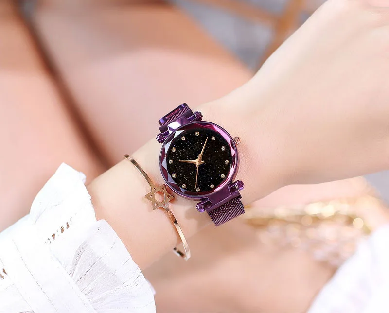 Часы наручные женские кварцевые с магнитной застежкой, модные роскошные с изображением звёздного неба, со стразами