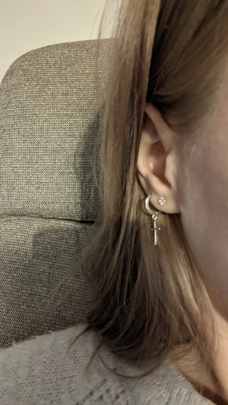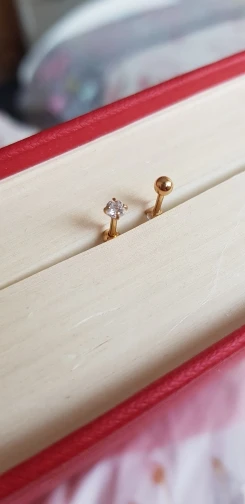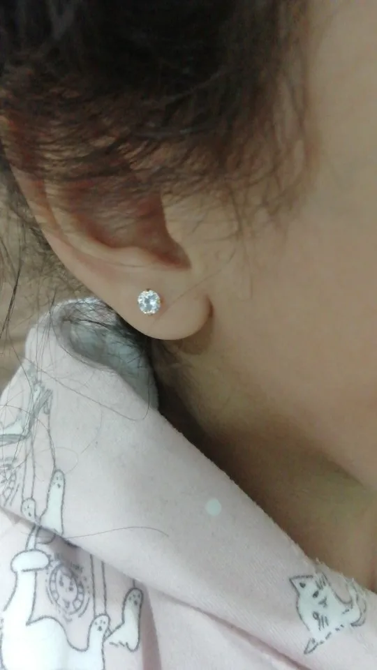 хорошие сережки, в ушах не чувствуются совсем, ношу несколько дней не снимая, пока не потемнели. единственное что мне не нравится, это то что их глубоко не закрутить, и иногда гвоздик может вылезать, на последнем фото видно о чем я говорю
