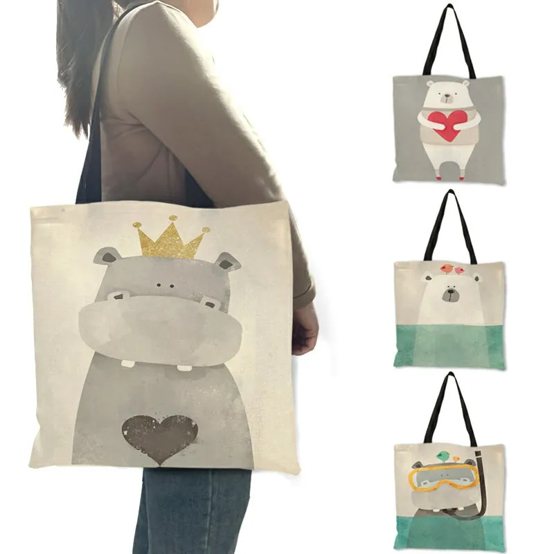 Экологичная Льняная сумка-тоут с креативным мультяшным бегемотом, модные женские сумки, многоразовые сумки для покупок, школьные сумки через плечо
