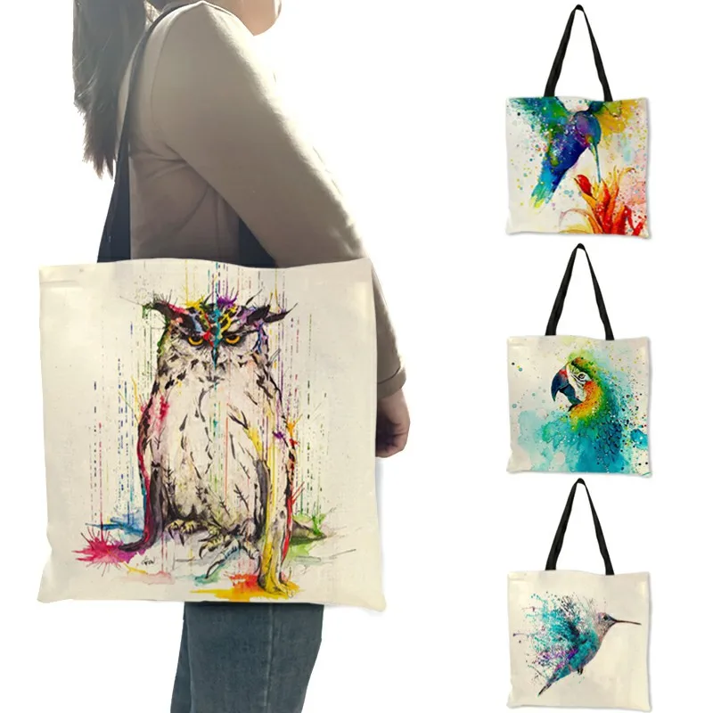 Креативный узор, женские сумки на плечо, акварельная художественная птица, Сова, стрекоза, сумка из эко льна, практичные повседневные Офисные Сумки