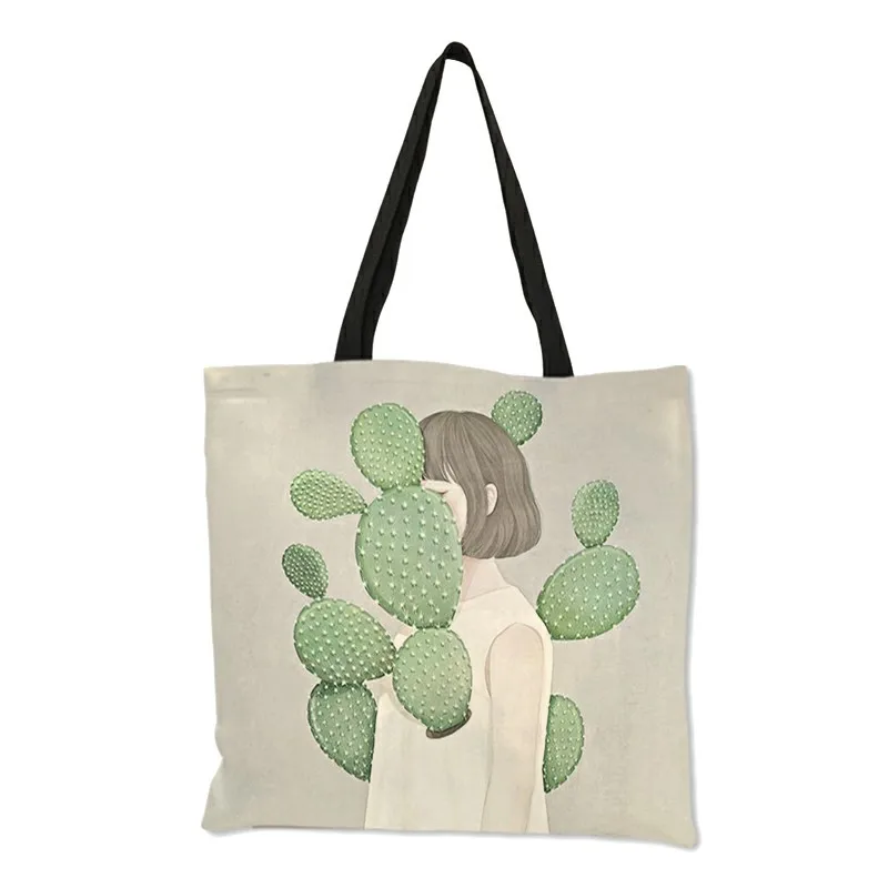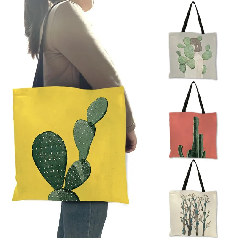 Сумка-тоут женская льняная с принтом кактуса, модный саквояж многоф...