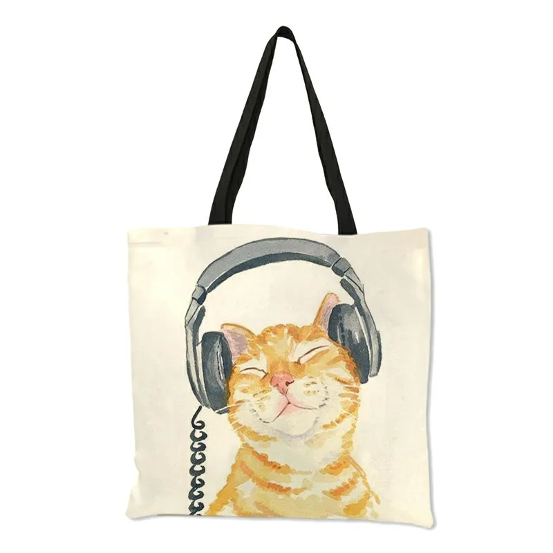 Сумка-тоут женская льняная, многоразовая, с принтом кошки, 2019
