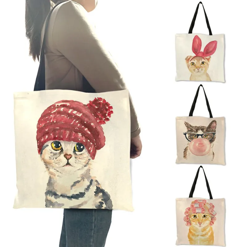 Красивая сумка для девочек, акварельная милая сумка на плечо с принтом кота, эко-Льняная многоразовая дорожная Повседневная Сумка-тоут для покупок