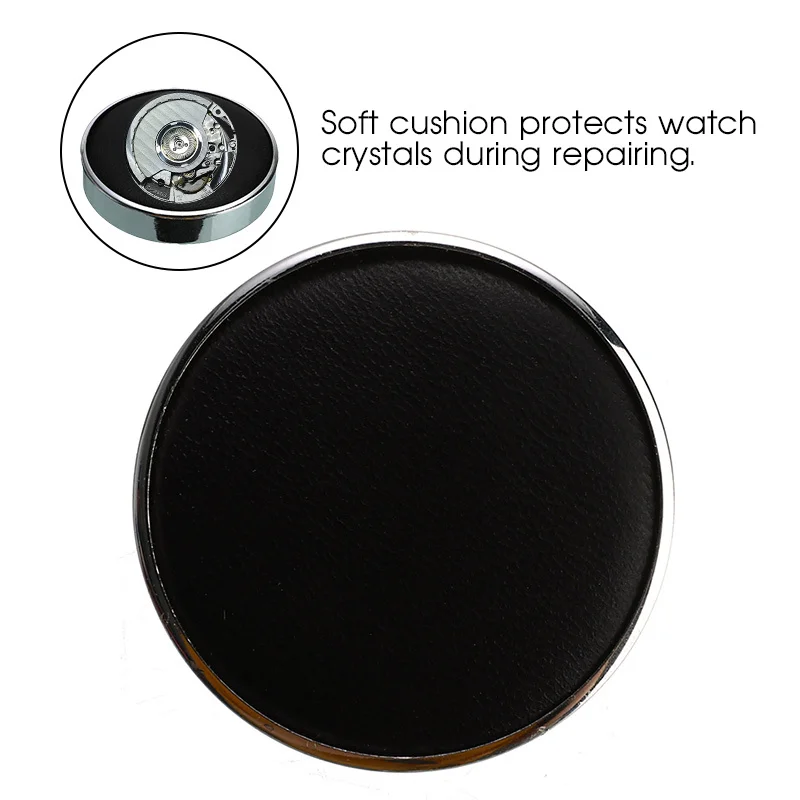 Чехол-Подушка-идеальный инструмент для рабочей поверхности корпуса часов.Безопасный способ не царапать часы при смене батареи, стекла или обслуживании часов.Нижняя часть изготовлена из противоскользящего материала, верх-искусственная кожа с углублением в центре, чтобы не повредить движение.Подходит для обсадных и необсадных движений, ослабления винтов, корректировки регулятора.Профессиональный инструмент для часовщика и Ремонтника часов.