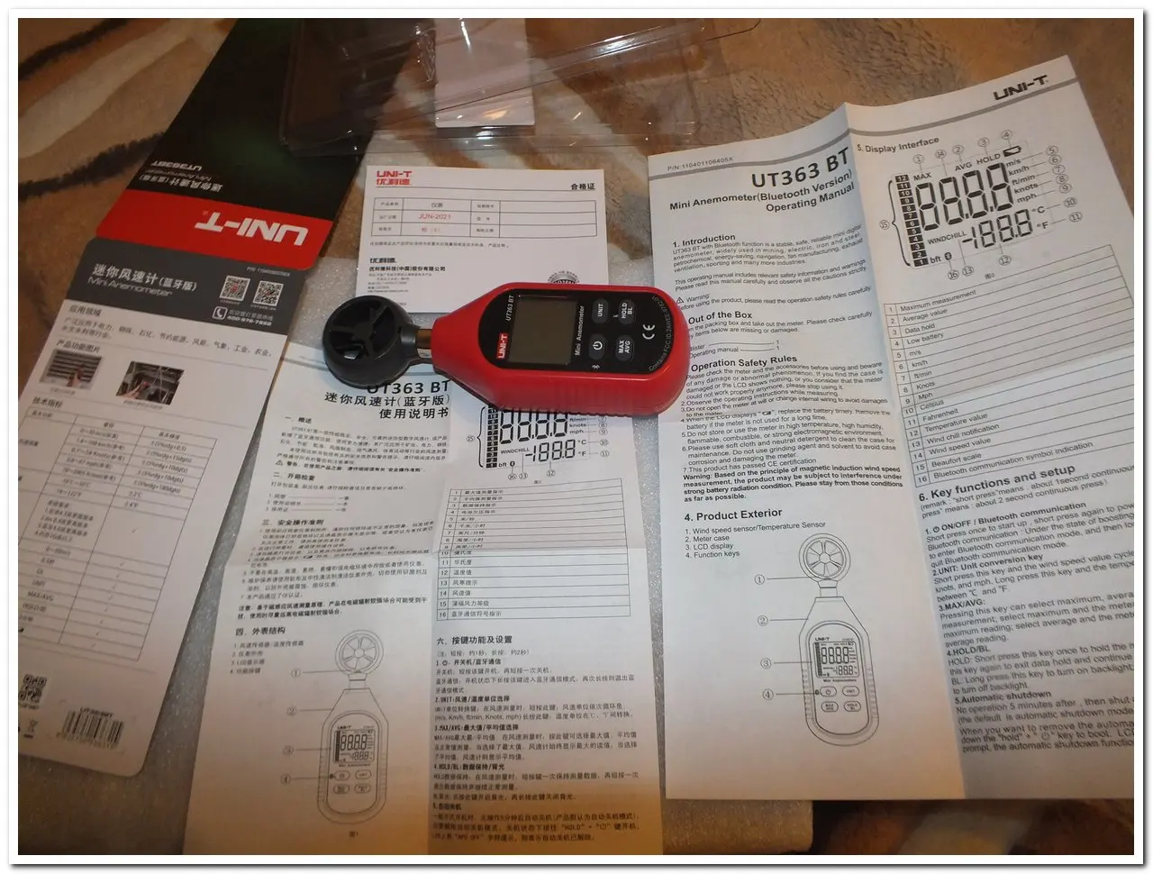 Дошло до Томска за 21 день почтой России. Как всегда приборы этой фирмы изготовлены очень качественно и работают надежно. Стал покупать от этой фирмы так как на работе есть устройства этой фирмы. Инструкция на английском языке но все и так понятно по обозначениям на корпусе и картинкам с нее. От аккумуляторов работает, оригинально сделана крышка батареек - она на шарнирах, не выпадет и не потеряется. Пять единиц измерения скорости воздуха и две - его температуры. Также есть международная шкала в баллах слева по экрану. Блютуз еще не испытал, жду еще шумомер от этой фирмы. Спасибо фирме UNI-T что она делает качественные измерения доступными всем! Благодарю продавца за надежный и недорогой товар, я очень доволен.