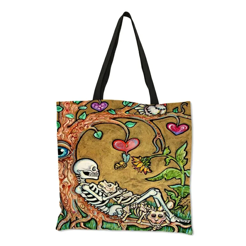 Льняная сумка-тоут с цветочным принтом и черепом, многоразовые сумк...