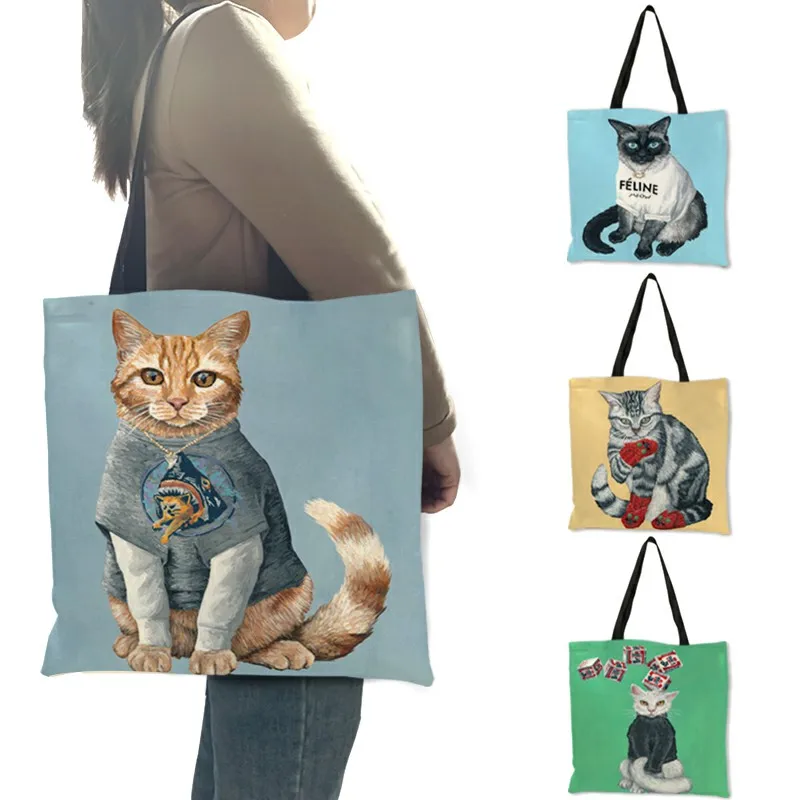 Прямая поставка, Индивидуальная сумка-тоут, Мультяшные животные, кошка, искусство, льняные сумки для женщин, эко, многоразовые сумки для покупок, путешествия