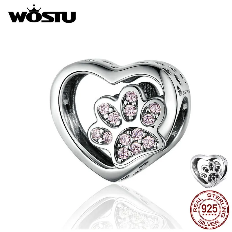 WOSTU Роскошные сердце лапа собаки, бисер из стерлингового серебра 925 пробы, розовый эмалевый Шарм, подходит к оригинальному браслету, подвеска из серебра 925 пробы, украшения CQC1191