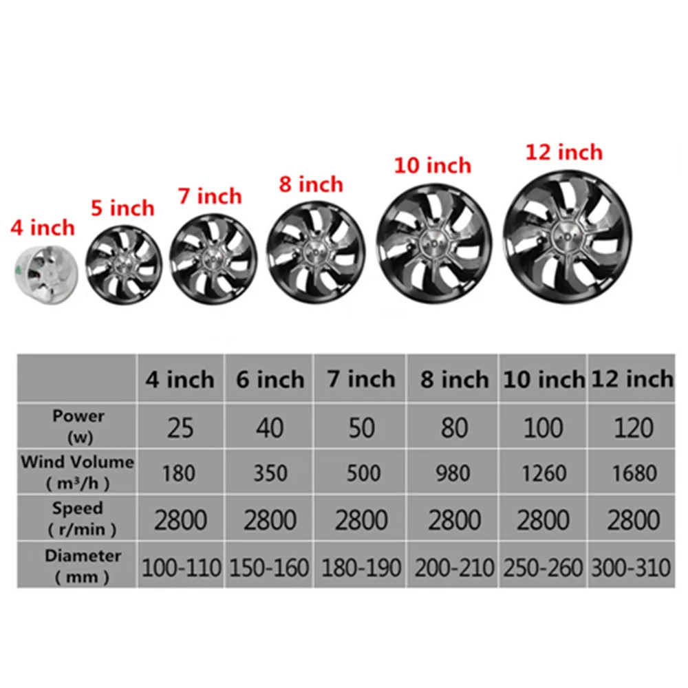 -Размер воздуховода: 4 "/ 6''/8 ''/10''/12''-Напряжение: 220 В/60 Гц-Скорость ветра (mmpm 3;/ч): 140-3000-Входная мощность: 25 Вт/40 Вт/80 Вт/100 Вт/120 Вт-1,5 M EU/US/AU/JP-вилка силовой линии