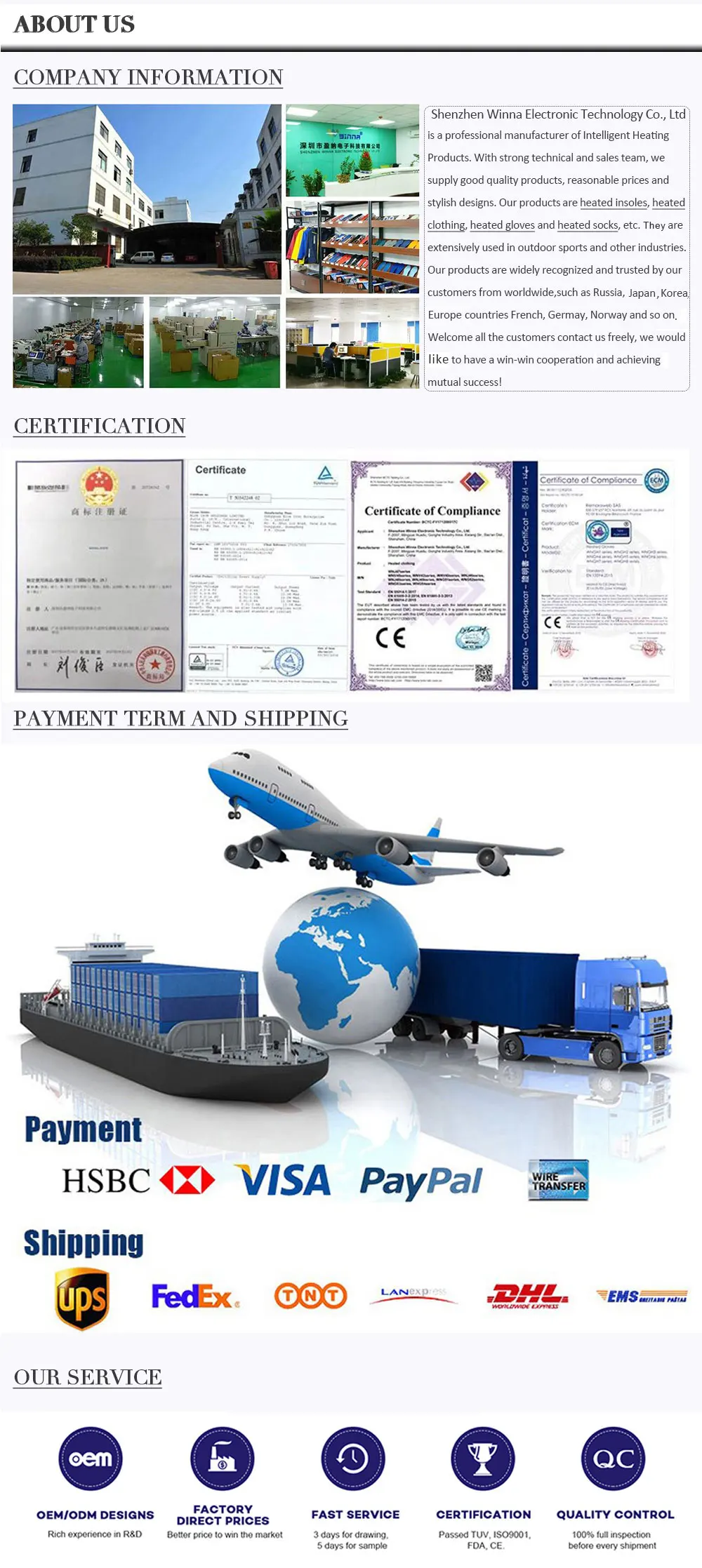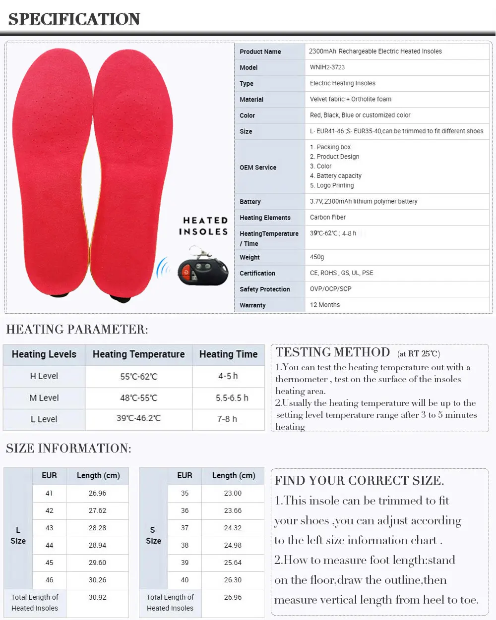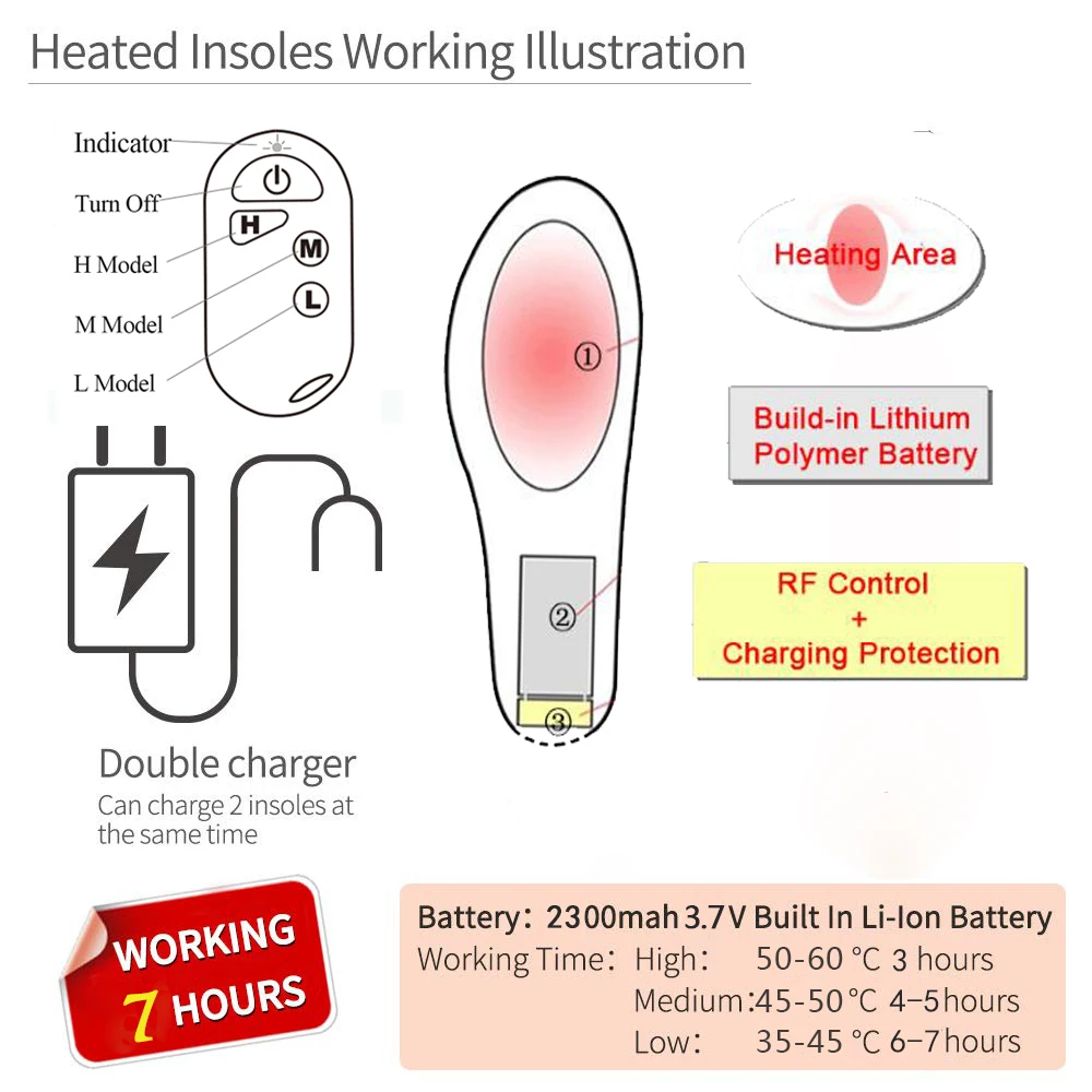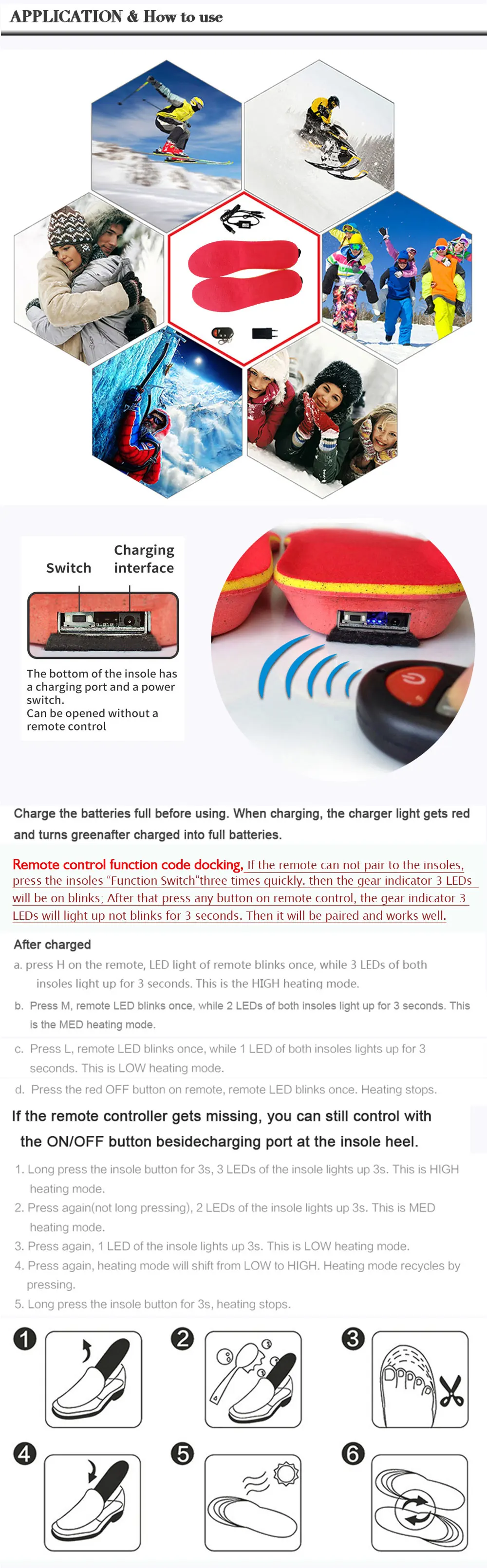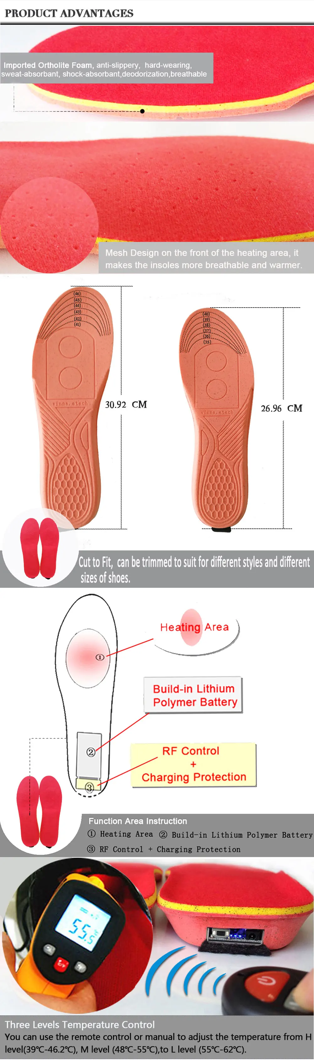 Все наши стельки с подогревом поставляются с гарантией 12 месяцев 2. Характеристики PODUCT: Три режима нагрева: высокий/средний/низкий, радиочастотный контроль, беспроводная стелька с электрическим подогревом;
