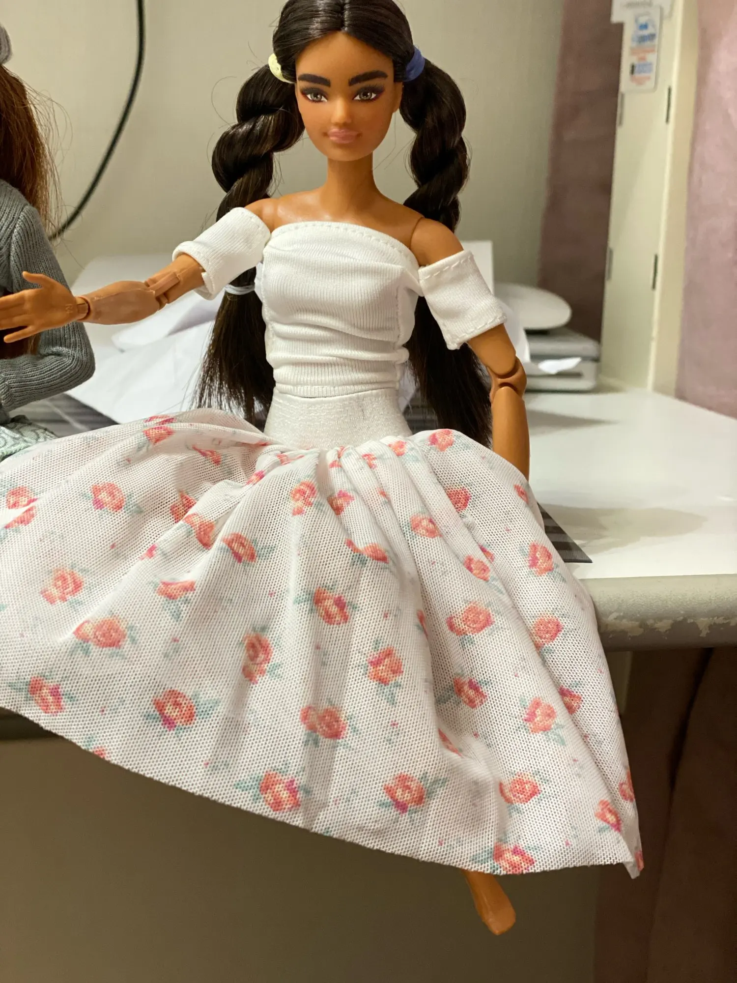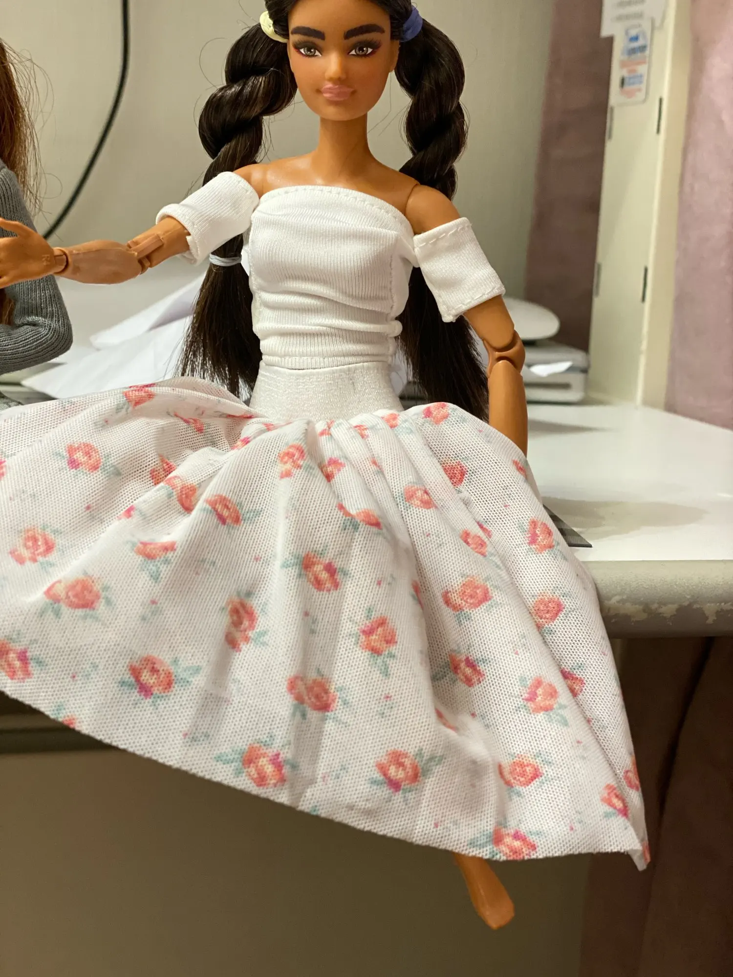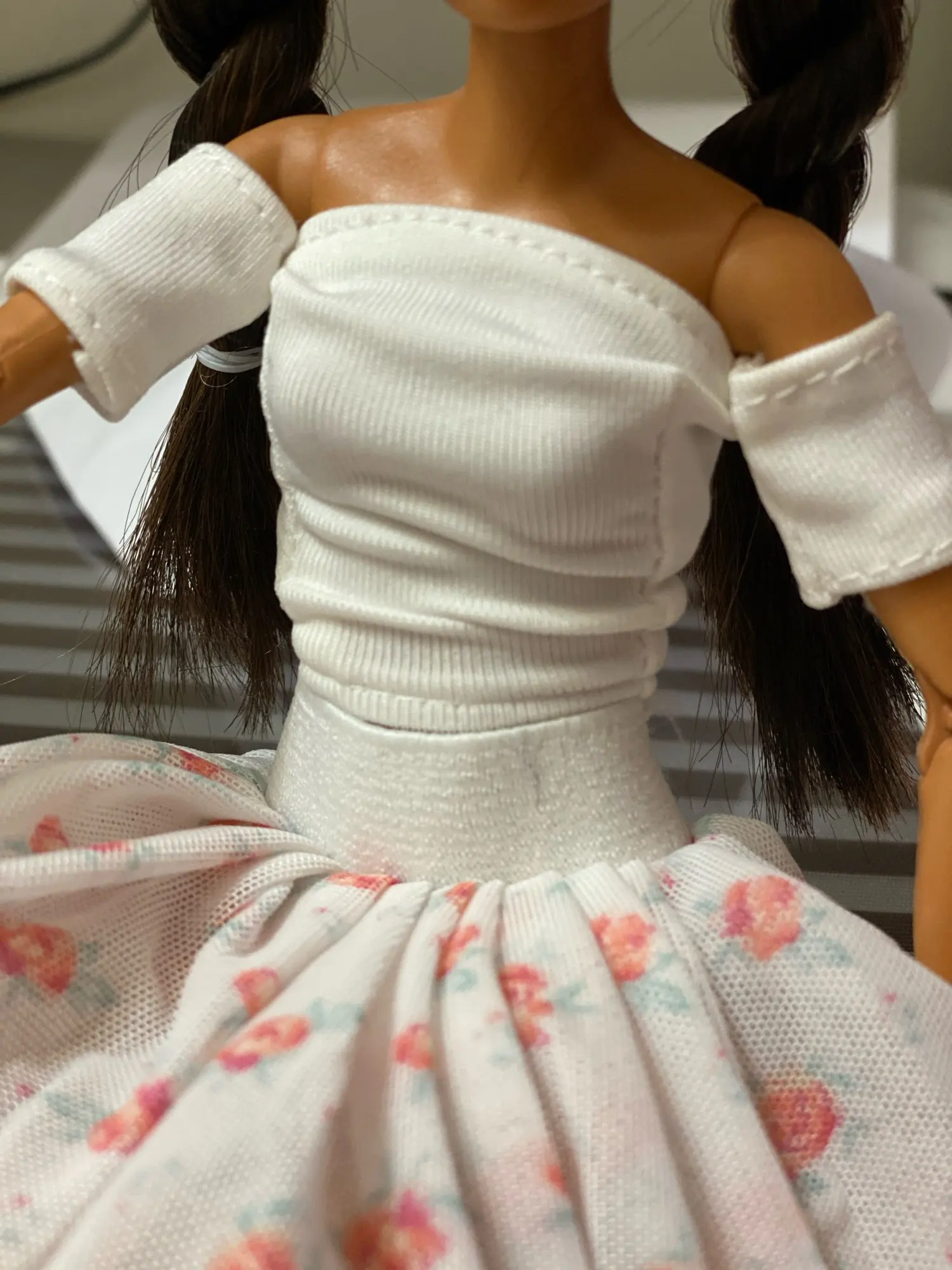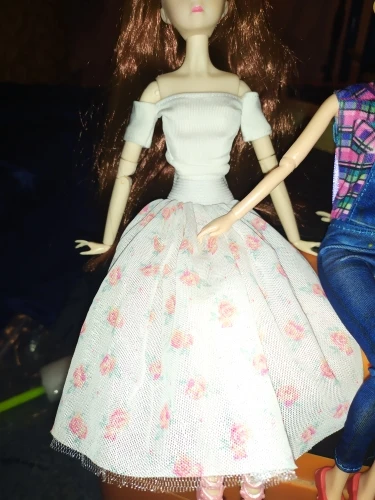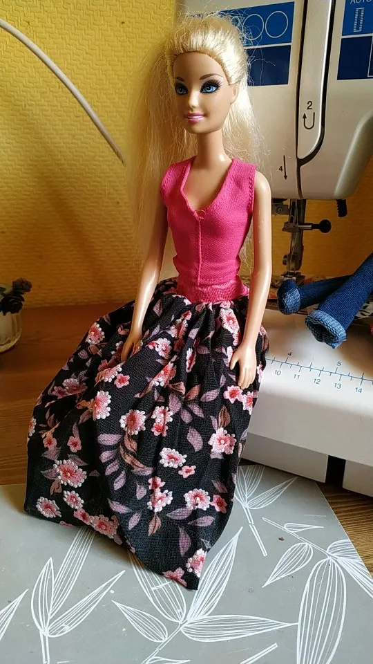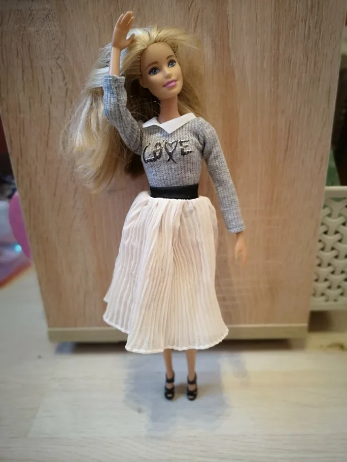 Кофточка маленькая еле хватает, грудь торчит. Посадка у юбки высокая, но при этом едва застегивпет на талии. Барби у меня стандарная. Одежда по размерам подходит не очень.