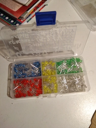 Доставка месяц.Набор хороший диоды 3мм,свет яркий, зелёный чуть тусклее.Сопротивления лучше подбирать к каждому типу отдельно.