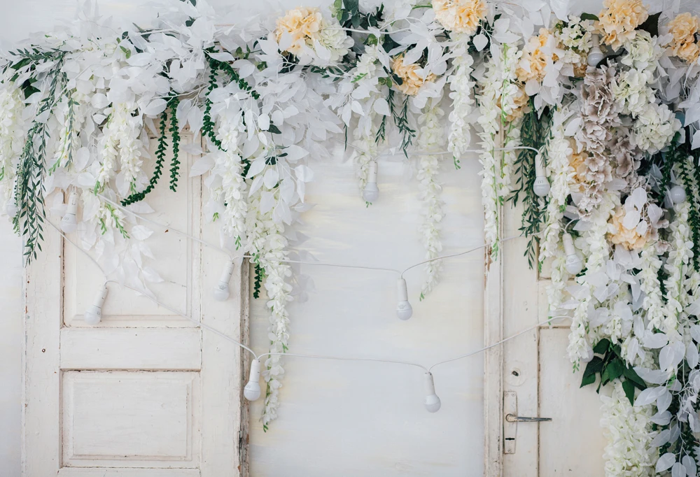 Фон для фотостудии, с изображением белых цветов, деревянной двери, свадебного душа