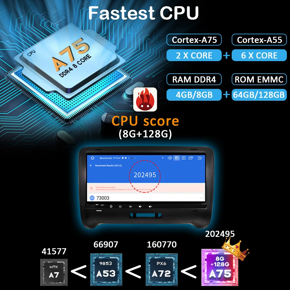 PX6-лучший чип на всем рынке в настоящее время, он работает быстрее всех типов. ANTUTU оценка 160770, это лучше, чем 7853 4G + 64G, это лучше, чем PX5, это лучше, чем все остальные 4 + 64G типа на всем рынке. Радио PX6 может загружать больше видов приложений для android с рынка android, а Приложение может работать лучше, чем другие радиотипы.