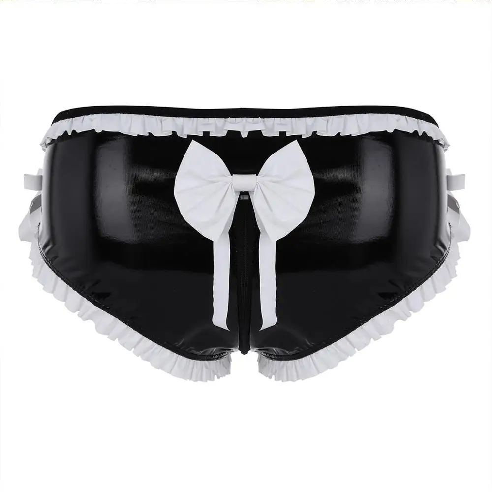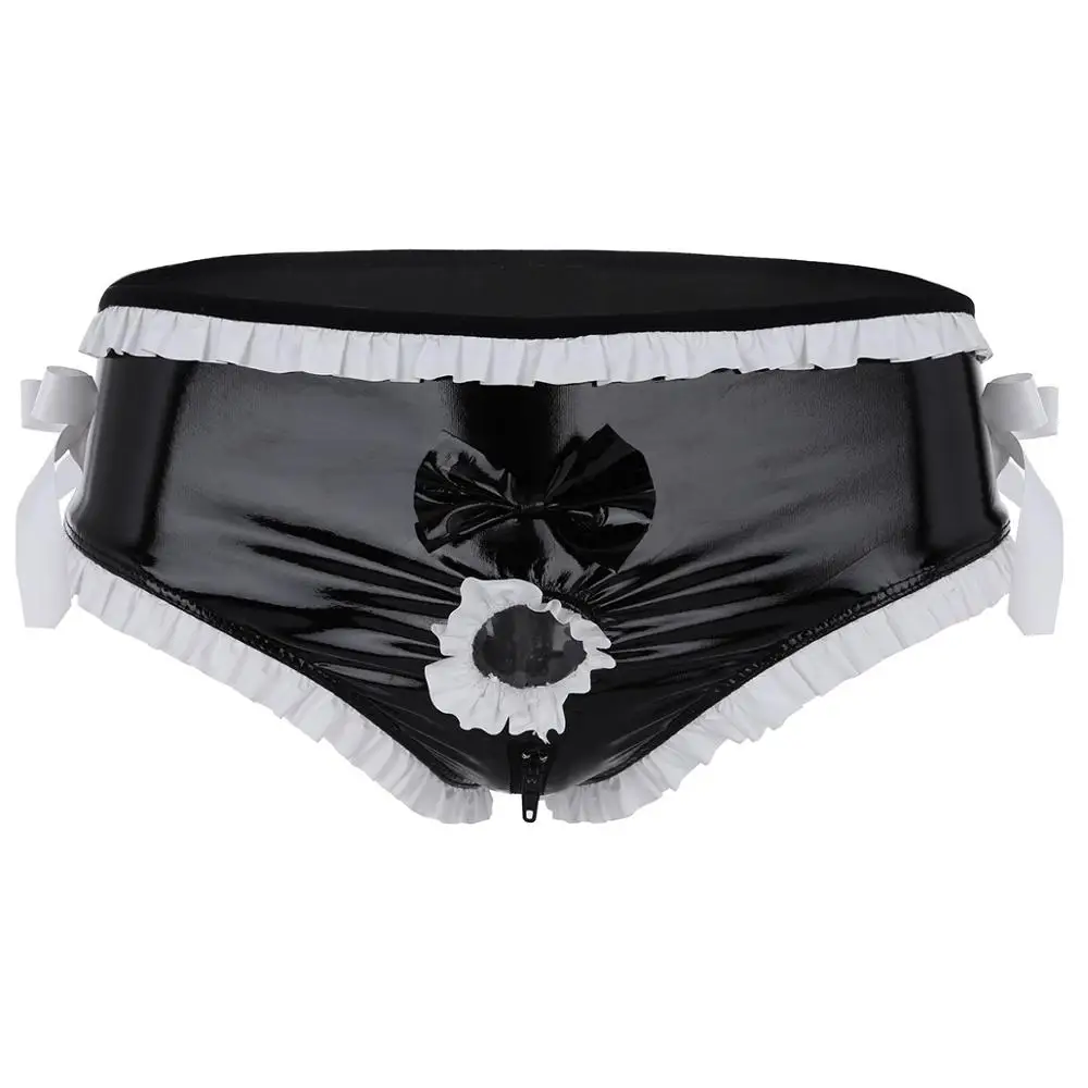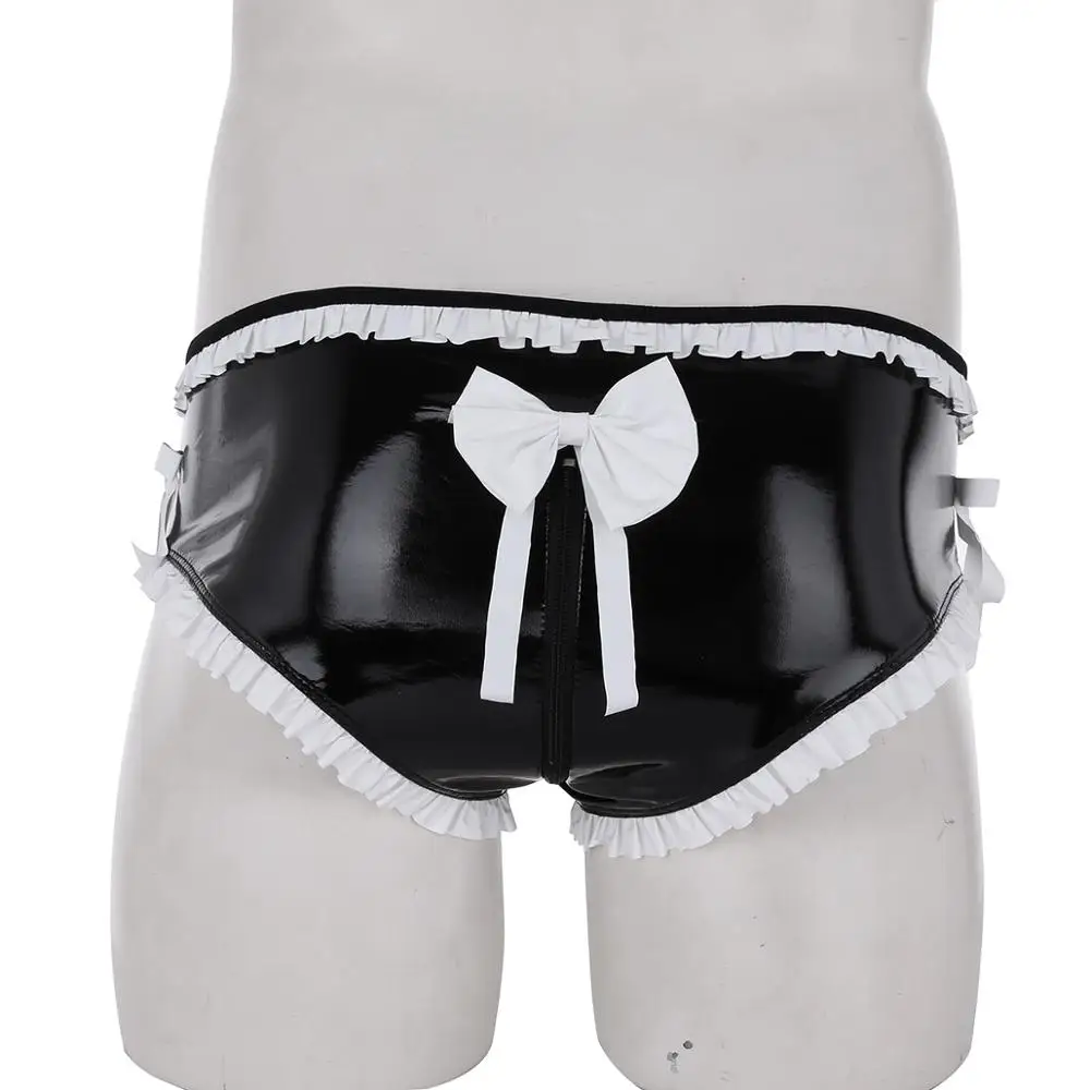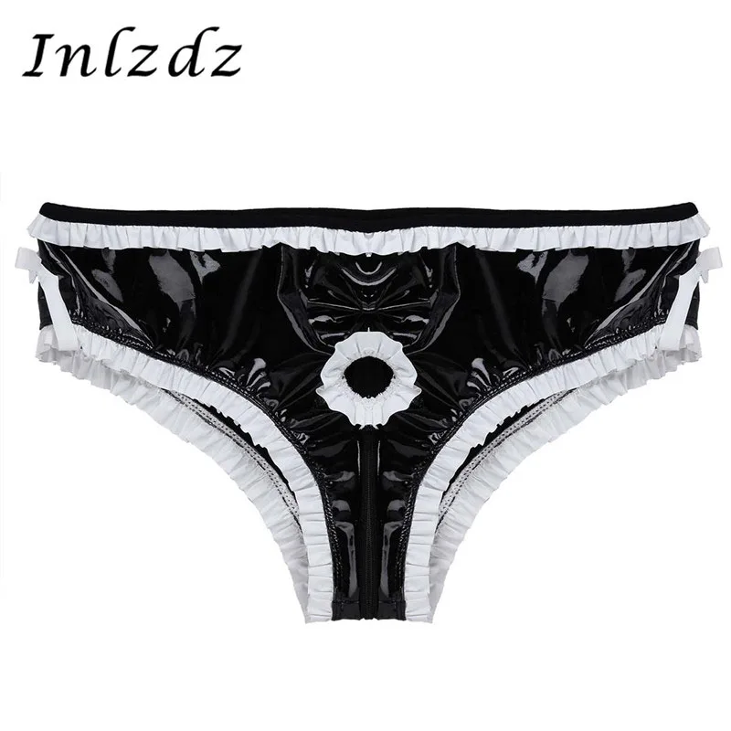 Особенности:Мужские трусы бикини, нижнее белье, хорошая эластичная блестящая ткань, мягкая и удобная.Эластичная резинка на талии; Модель с молнией и шаговым швом; С белой оборкой и бантом для украшения.Спереди с кольцом в основании вала пениса, способствует продлению эрекции.Идеально подходит для ночного белья, для сна или для самостоятельного удовольствия.Пожалуйста, внимательно проверьте размер перед покупкой, рекомендуется ручная стирка.