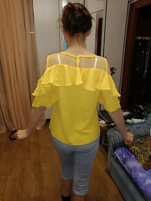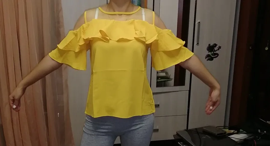 Симпатичная блузочка, соответствует описанию. Качество вполне приличное, правда, швы под рюшей не очень. Материал - синтетика под шифон. Размер М на русский 44-46. Доставка до Ростова-на- Дону 3 недели. С продавцом не связывалась. Рекомендую