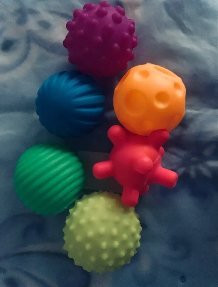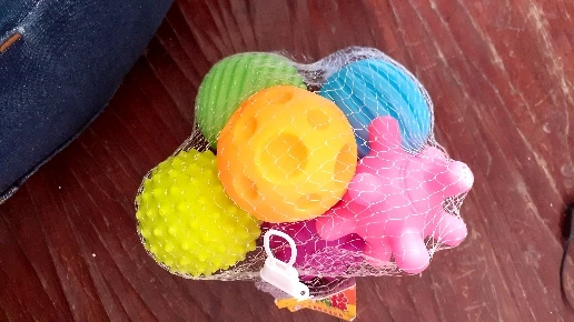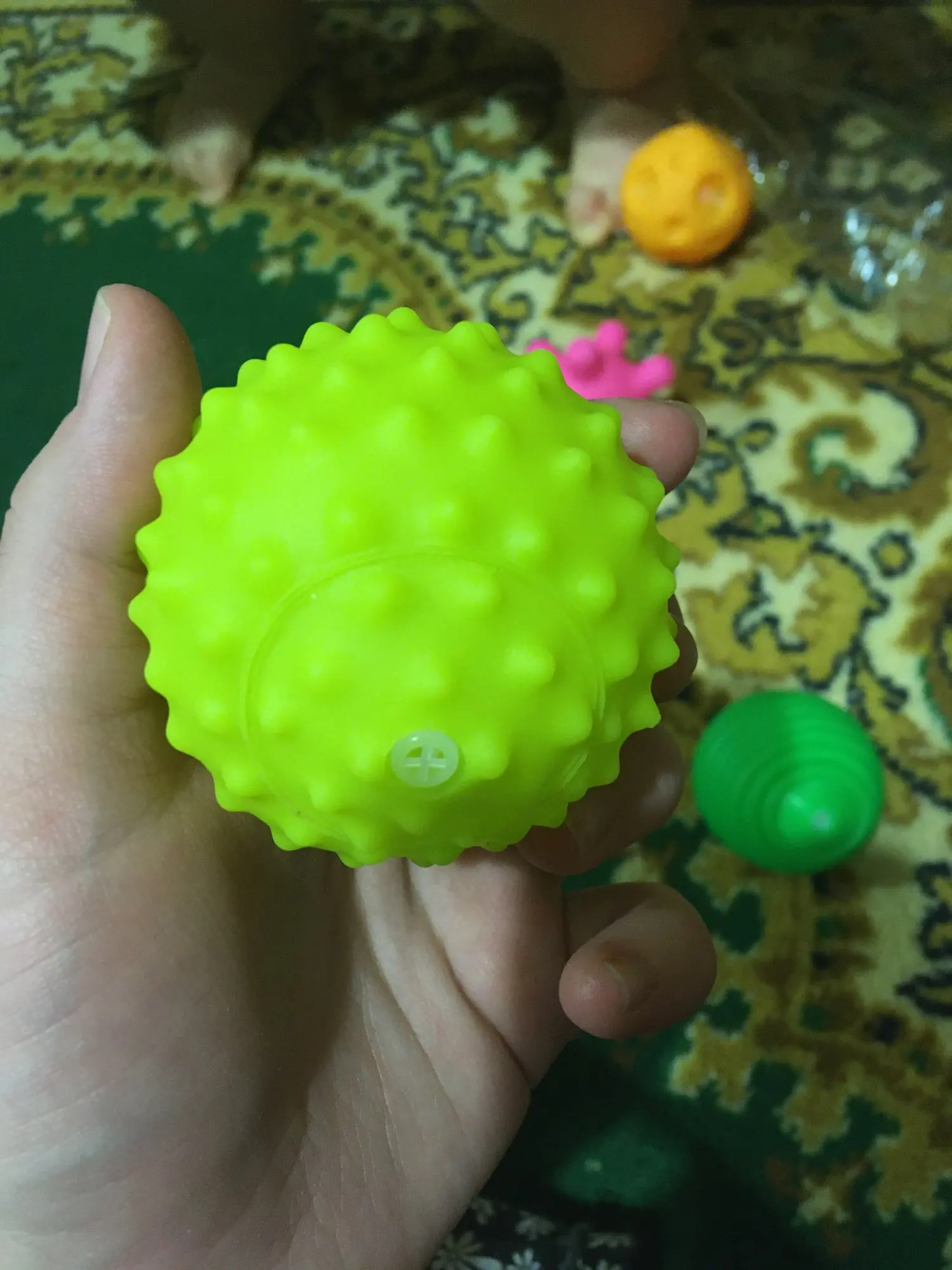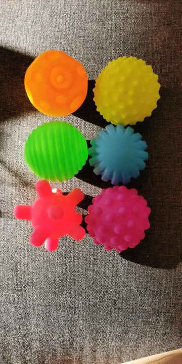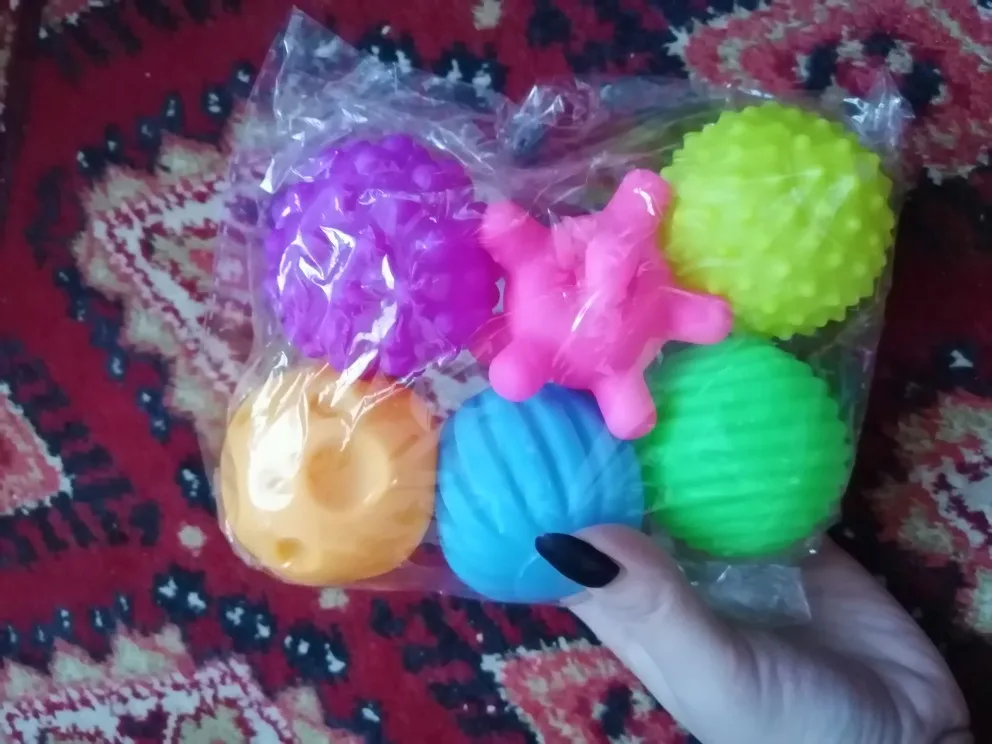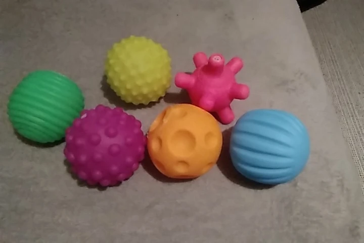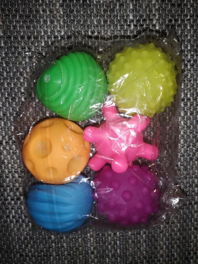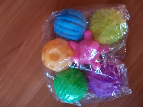6 шариков разной формы, довольно тонкие - легко сжимаются, в целом это даже плюс - ребёнку нравится сжимать в руке. Пищат, но я вытащила и выбросила «пищалки», т.к. ребёнок может довольно легко их вытащить и проглотить.