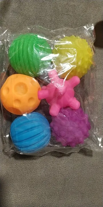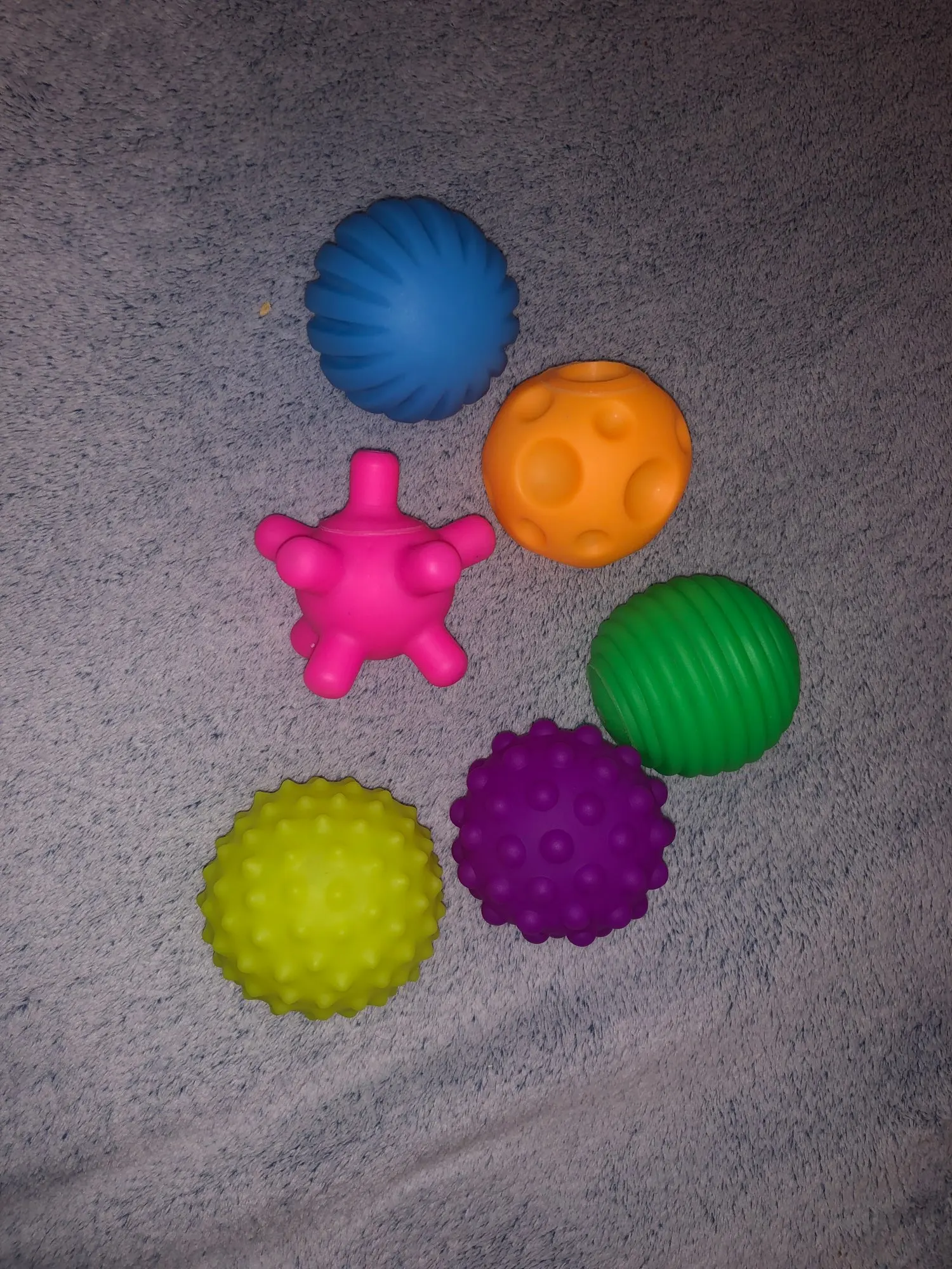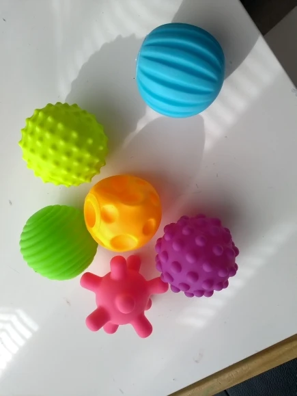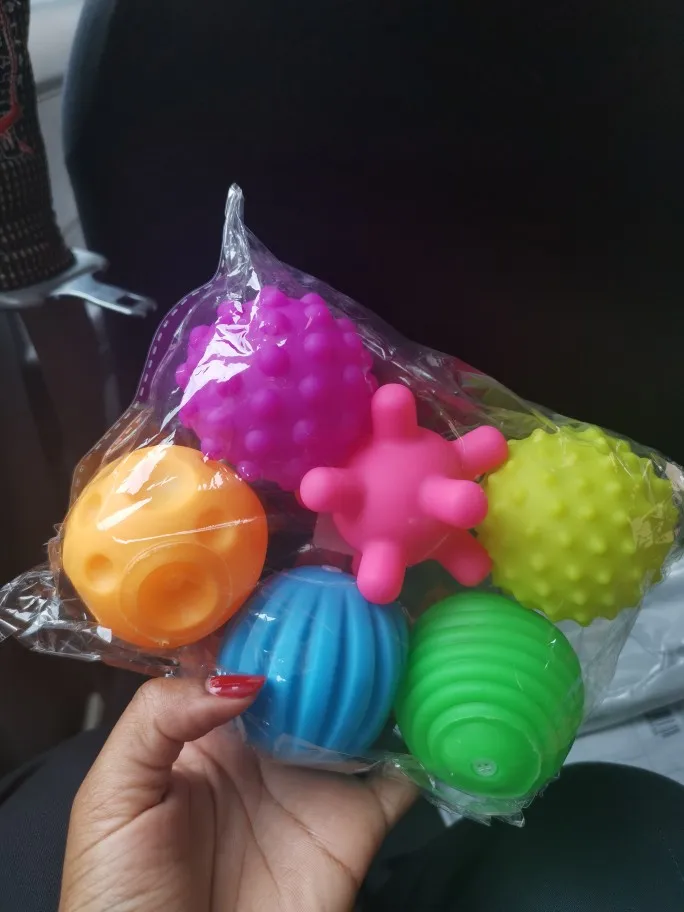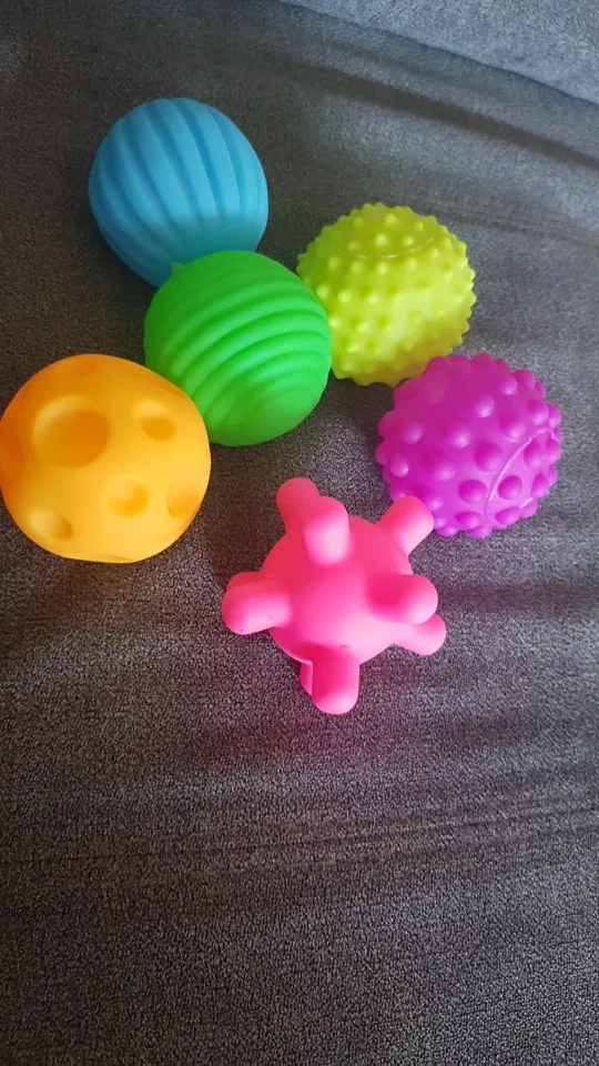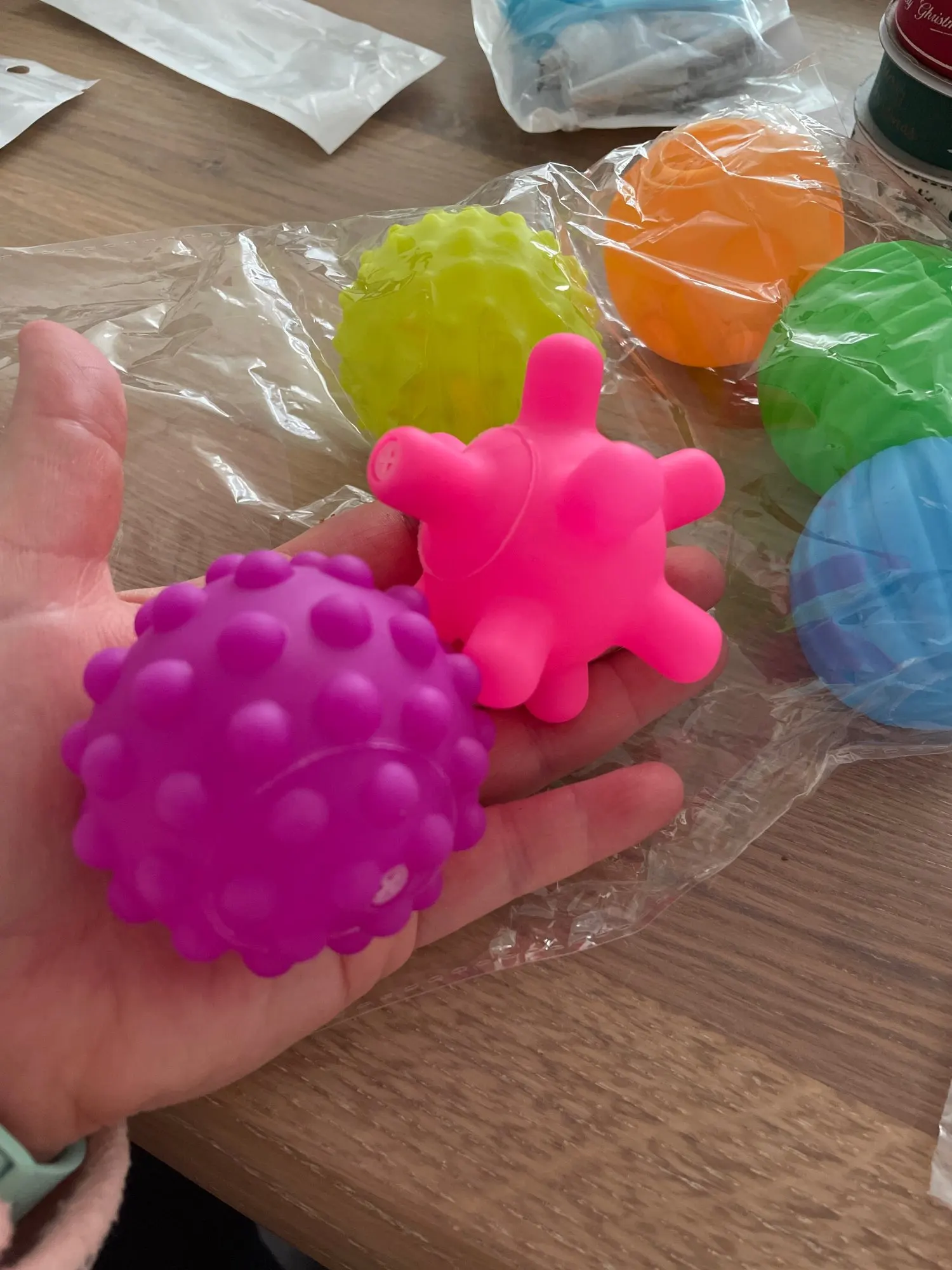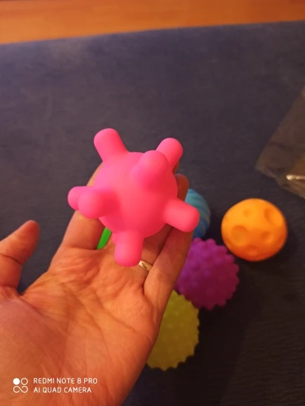 6 шариков разной формы, довольно тонкие - легко сжимаются, в целом это даже плюс - ребёнку нравится сжимать в руке. Пищат, но я вытащила и выбросила «пищалки», т.к. ребёнок может довольно легко их вытащить и проглотить.