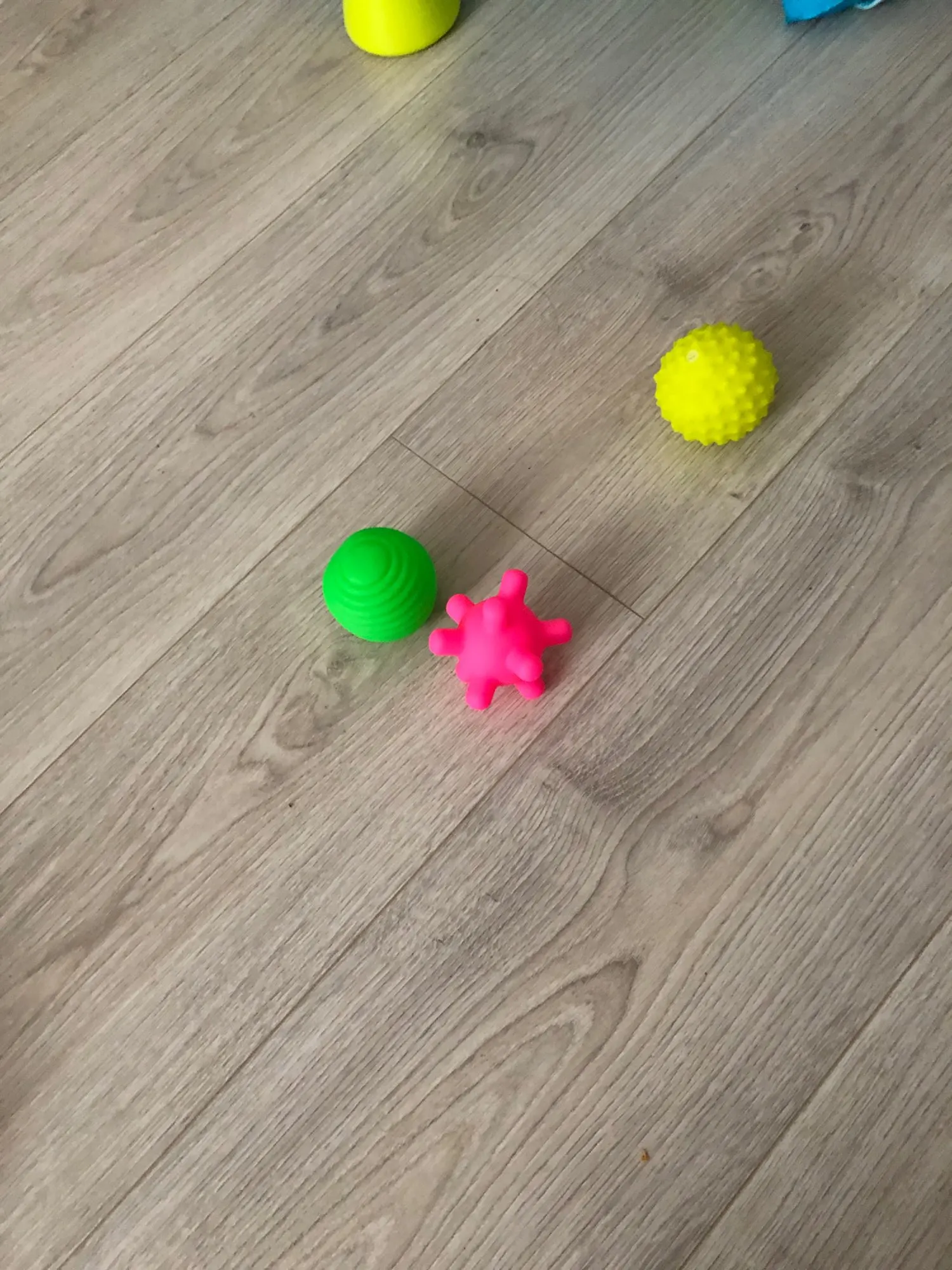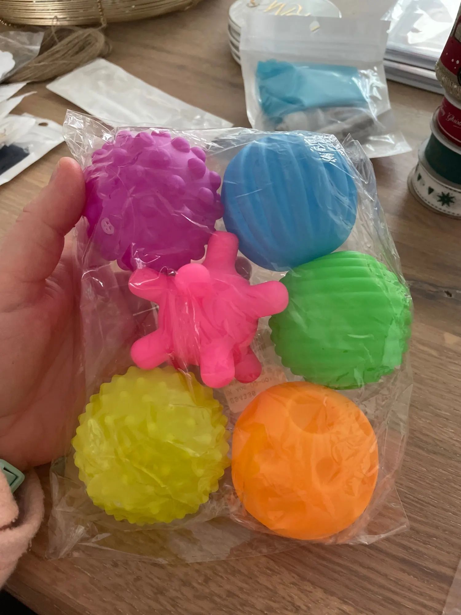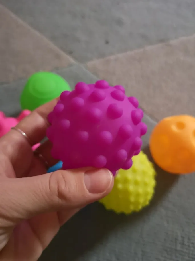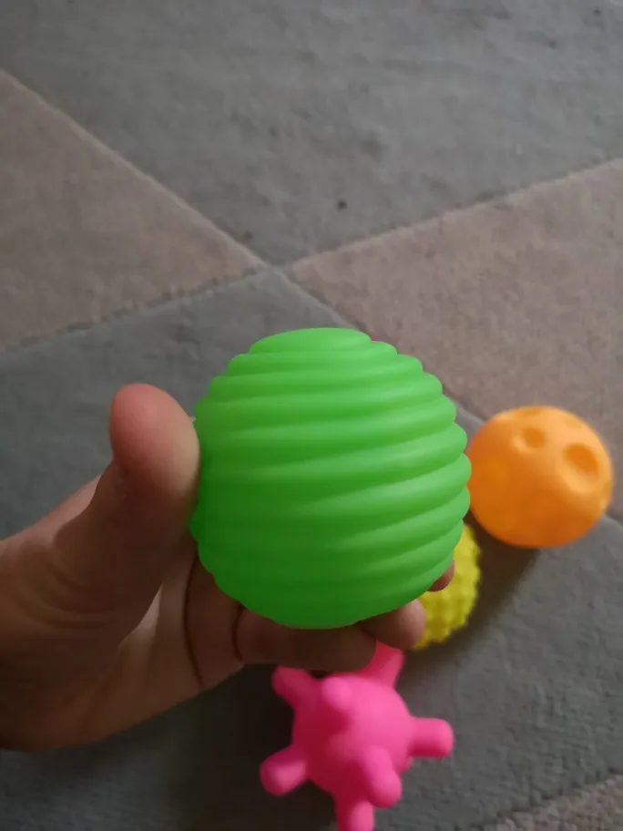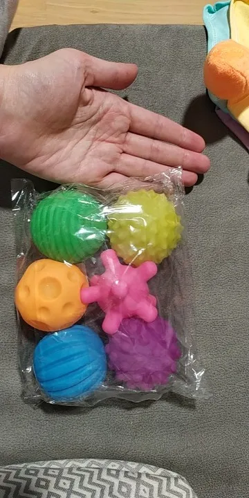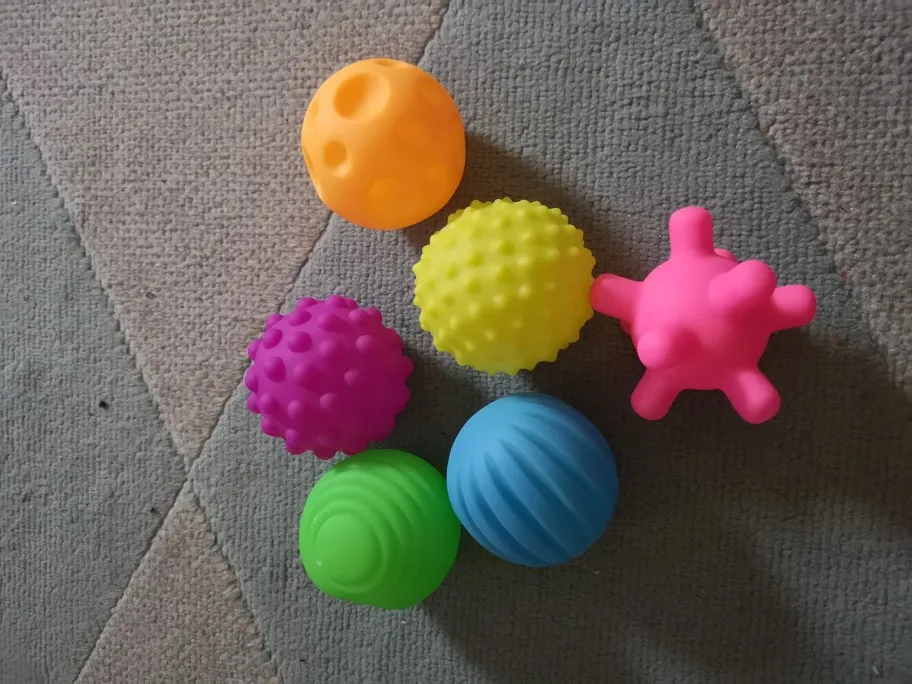 6 шариков разной формы, довольно тонкие - легко сжимаются, в целом это даже плюс - ребёнку нравится сжимать в руке. Пищат, но я вытащила и выбросила «пищалки», т.к. ребёнок может довольно легко их вытащить и проглотить.