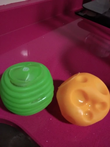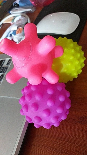 Хорошая игрушка. Цвета немного ярче, чем на фотографии продавца, например, средний шар ярко-розового цвета. Создавайте звук, когда вы их сжимаете. Достаточно мягкий для восьмого месяца, чтобы иметь возможность сжимать их. Нет запаха. Около месяца, чтобы прибыть в Toronto. Единственным недостатком является то, что есть немного дополнительной резины, которая выглядит как ПРИШИТАЯ на шарики, где формовочная форма должна быть разделена. Но ничего крупного.
