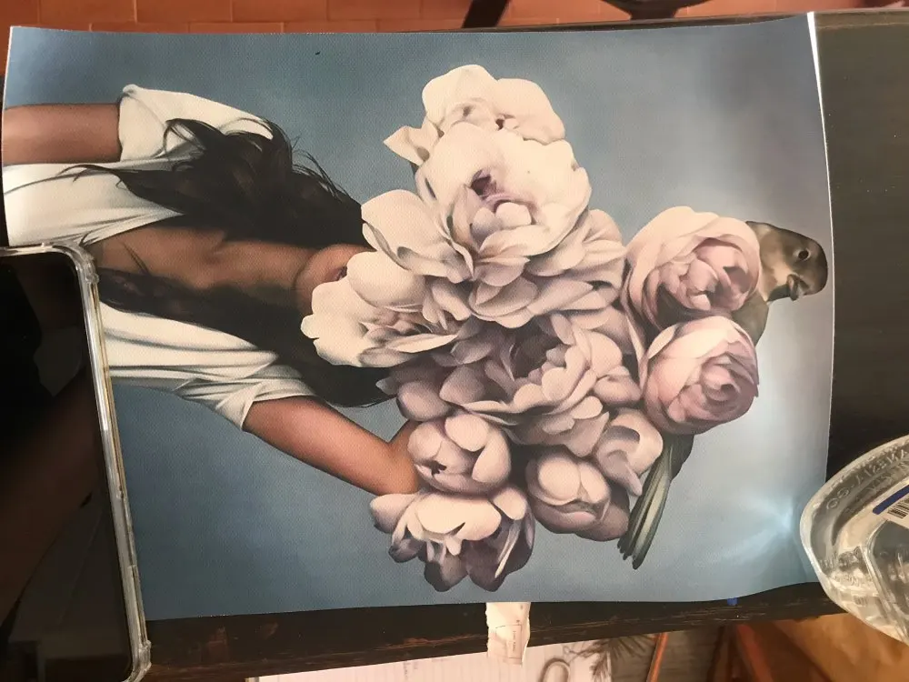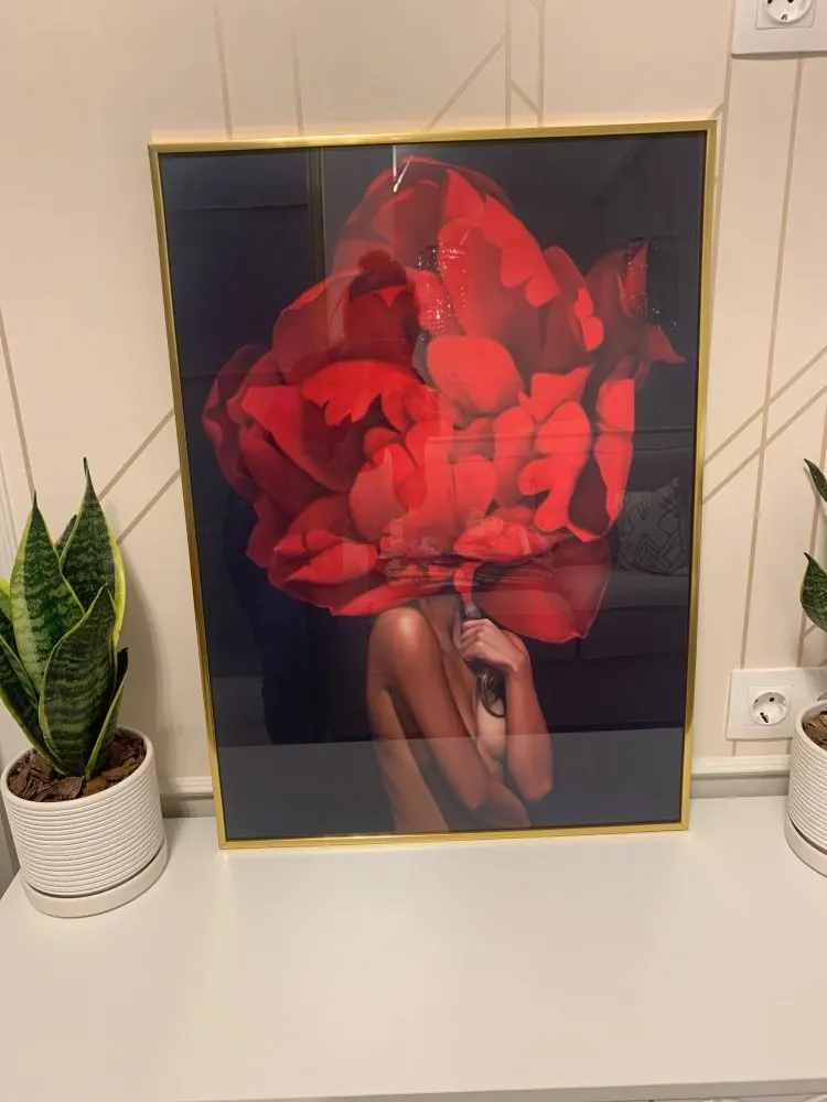 картина пришла , довольно быстро ,упакована в тубус, в общем картина понравилась, но пришла без рамки для картины ,просто смотана трубочкой в тубусе, и цвет там где должен быть чёрный , какой-то серо синий