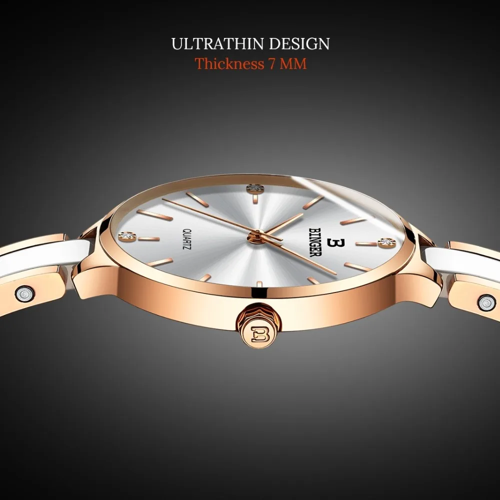 Женские модные часы от топ бренда BINGER, Роскошные ультратонкие женские часы с сапфировым керамическим ремешком, водонепроницаемые кварцевые женские часы под платье