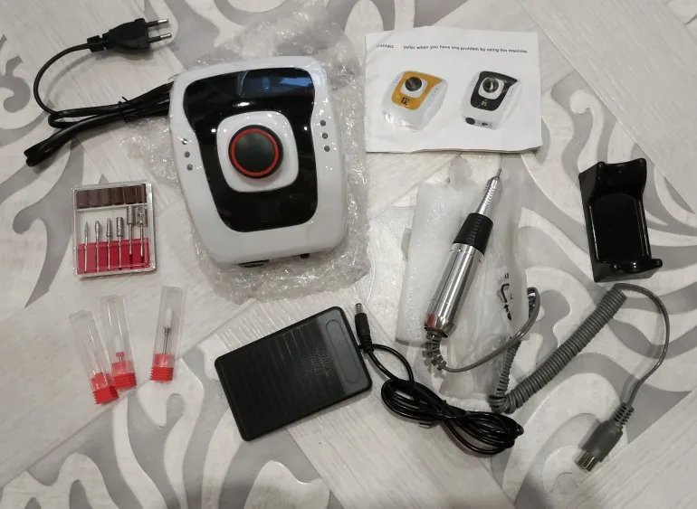 Заказ пришёл через месяц до Самары. Комплектация как в описании, заказала похожий аппарат у другого продавца, так аппарат существенно тяжелее и оборотов побольше. У этой модели слабый мотор, на 35000 обороты не тянет, для дома поиграться, для работы мастера маникюра очень слабый, хотя ручка неплохая. Заказ принёс курьер. В целом все соответствует, продавца рекомендую.