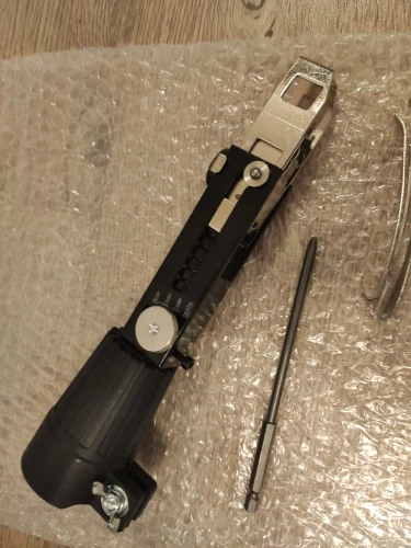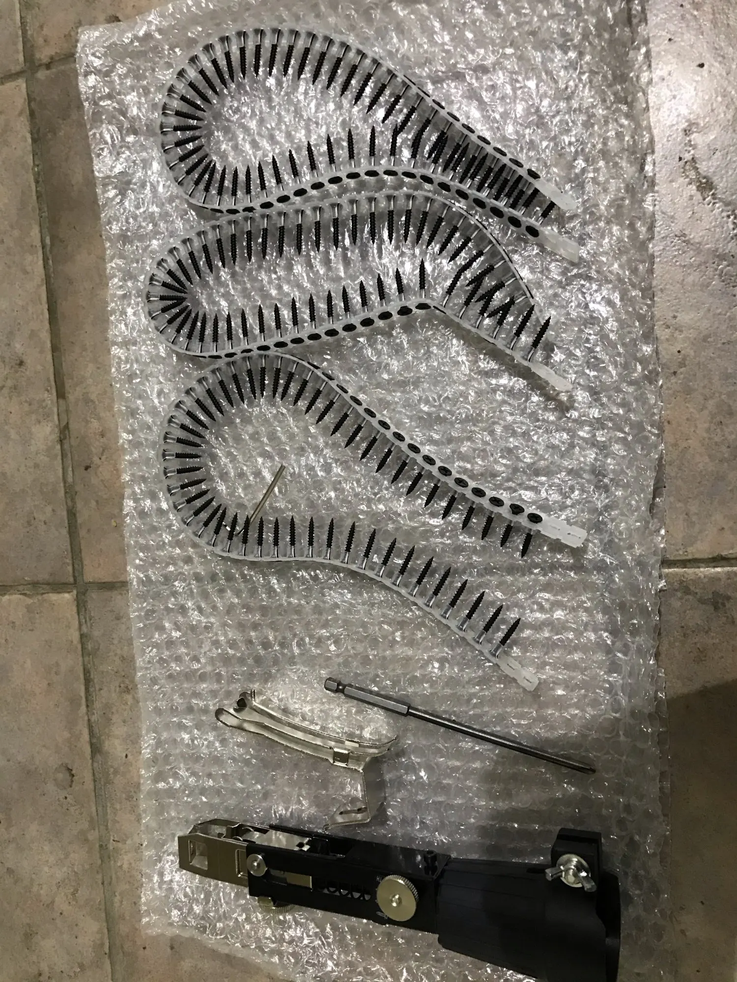 Выглядит хорошо. Все сделано крепко. В комплекте направляющая для ленты, одна лента с шурупами, малый шестигранный ключ и длинная бита. Осталось набросить на шуруповерт. Изделие прямо из коробки готово к применению. Это здорово.