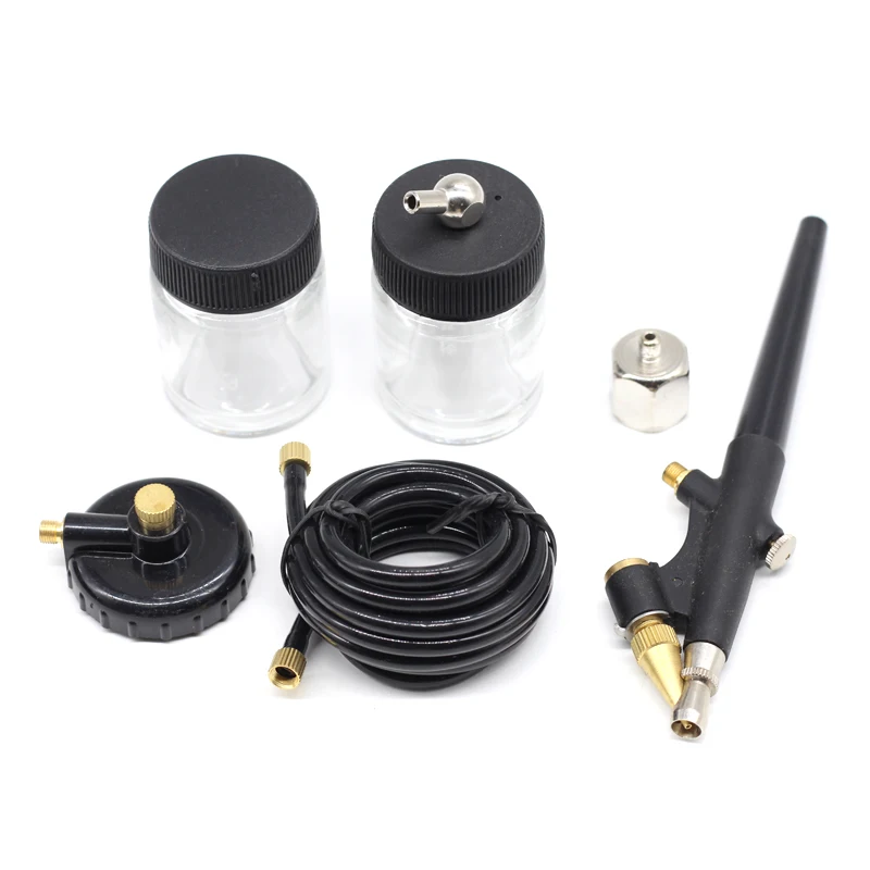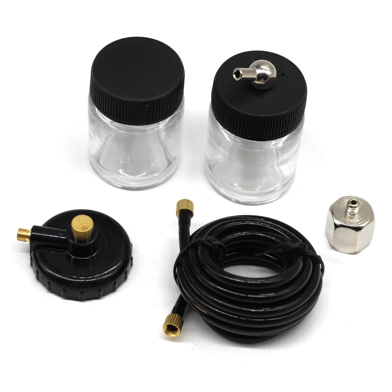 Включает тонкую головку аэрографа, полиуретановый шланг 5 футов, с крышкой, прикрепляющей банку 22 куб. См, регулятор пропеллера и адаптер (воздушный шланг 1/4 дюйма от компрессора к меньшему шлангу аэрографа.)