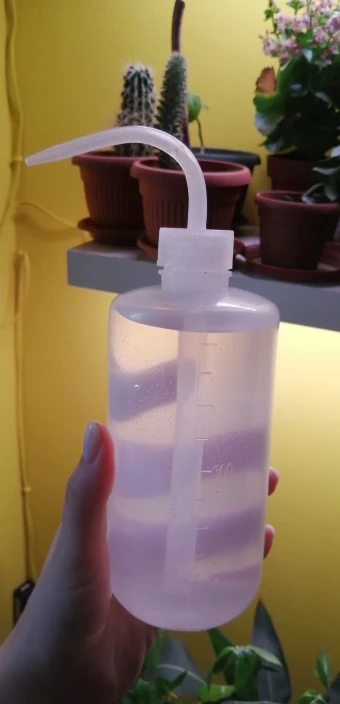Мягкая, легко пользоваться. Носик хорошо заходит под листья растений, использую при поливе суккулентов и фиалок. Единственное, уже слегка зацветает бутылка, т.к. воду из нее до конца не вылить из-за того, что плечики примыкают под углом 90 градусов, всегда несколько мл в бутылке плещется. Химикатами не промываю, потому что - см. п. 1 - не промывается до конца). Не хочу поливать цветы химикатами.