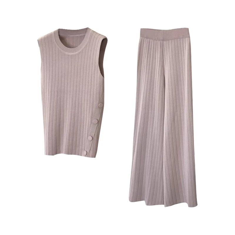 Женский вязаный жилет и брюки ALPHALMODA, без рукавов с боковыми пуговицами + широкие штаны, повседневный вязаный комплект из 2 предметов на лето 2019