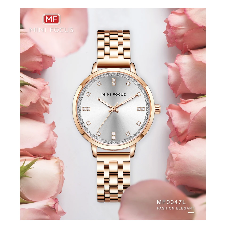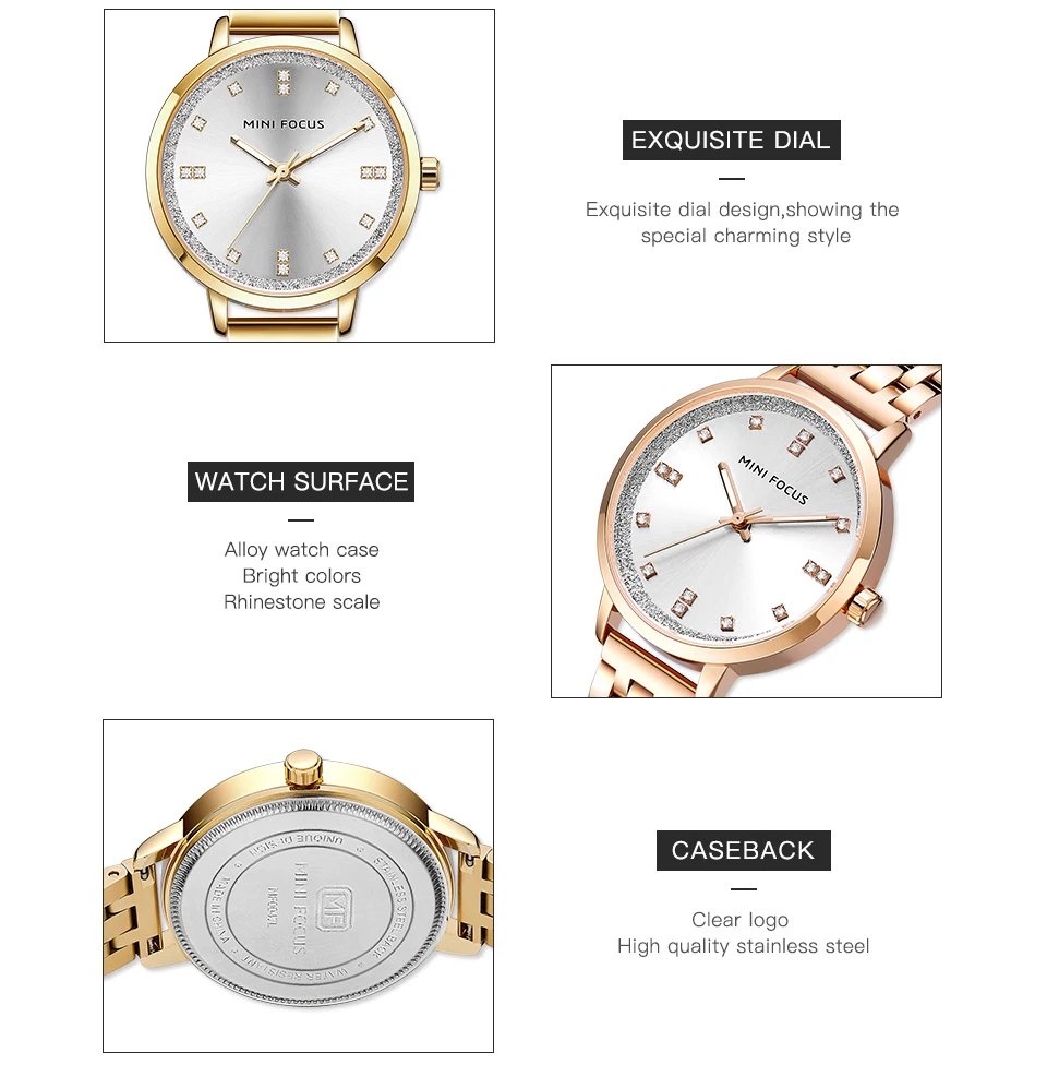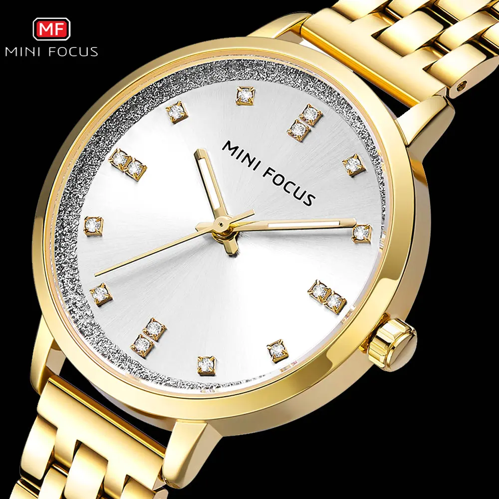 Часы наручные MINI FOCUS женские кварцевые, брендовые Роскошные водонепроницаемые полностью стальные, с ремешком под платье, Королевский золотой цвет